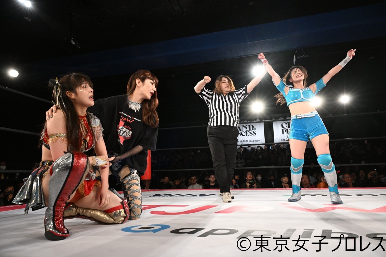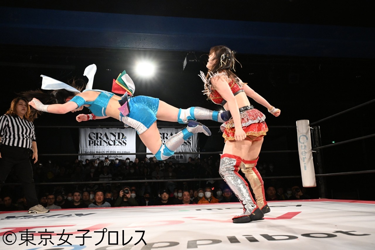 東京女子プロレスが12月27日、東京・新宿FACEで年内最終大会『TJPW Year-End Party 2025』を開催した。2026年イッテンヨン(1月4日)後楽園ホールでOber Eats(上福ゆき&上原わかな)の持つプリンセスタッグ王座に挑む、『春雷烈火!!プリズムグリード』(愛野ユキ&風城ハル)の風城がシングルマッチでの前哨戦で上原を破り初のベルト獲りに弾みをつけた。