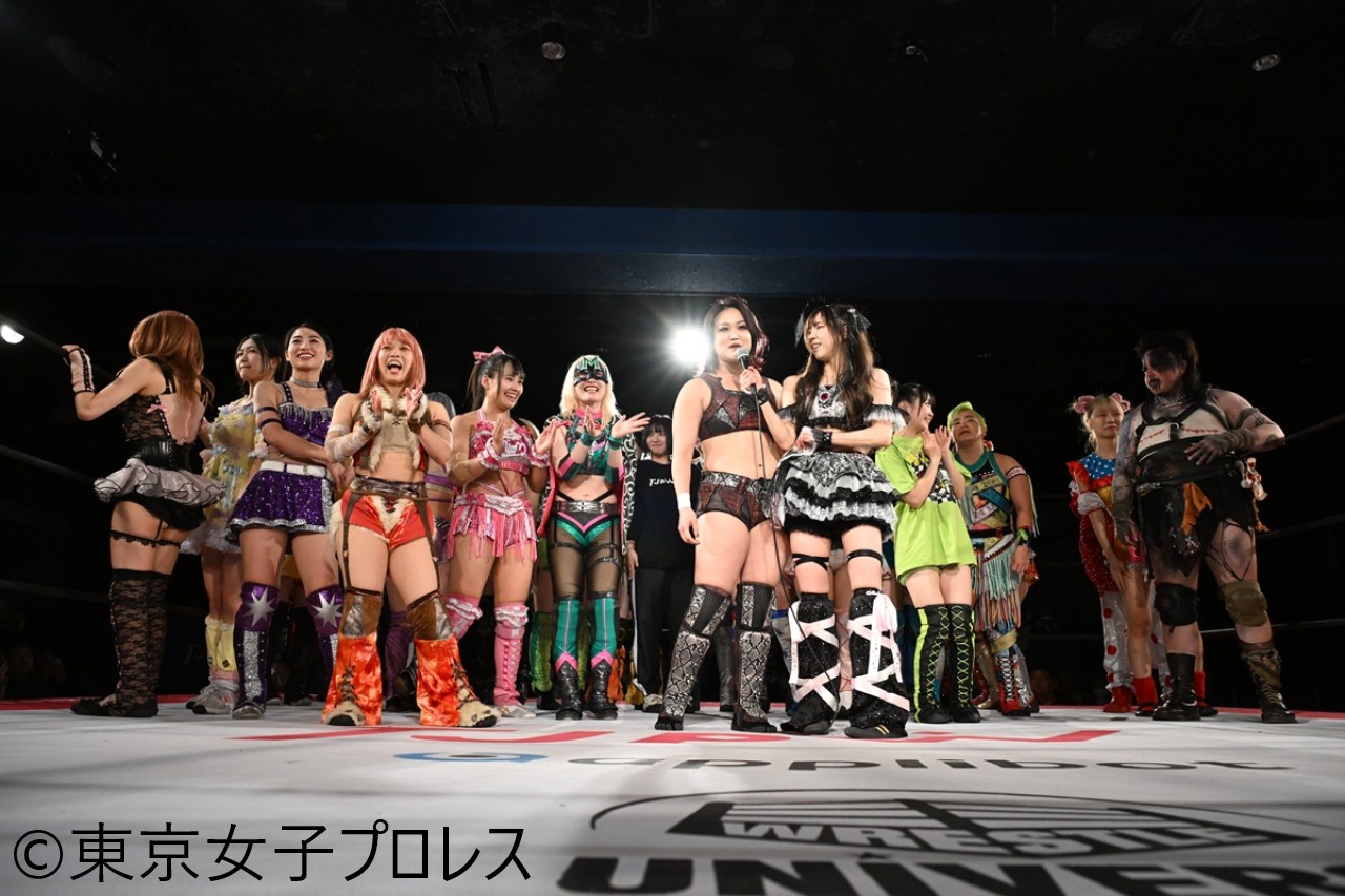 また、メインイベントでは「来年も嬉しいこと楽しいこといっぱいあるといいね! PRINCESS RUMBLE 2025」(19人参加)が行われた。山下実優、XX(水波綾)、マックス・ジ・インペイラー、渡辺未詩らの有力選手が次々に退場となるなか、最後は瑞希が芦田美歩をキューティースペシャルで仕留めて優勝。瑞希は「年内最後の試合だったんですけど、日常は別にして私も選手のみんなもきっと、リングの上ではひとつも手を抜かず走り抜けたと思います。きっとうれしいこととか悔しい思いとかたくさんしてきたと思う。でもこうやって応援してくれてる皆さんと一緒に歩んでいけることがすごくすごく幸せなので。2025年が終わるんですけど、あっという間に2026年が来るんでそのときもついてきて下さい」とあいさつ。全選手がリングに集結すると、リーダー山下の音頭の一本締めで2025年の全大会が幕を閉じた。