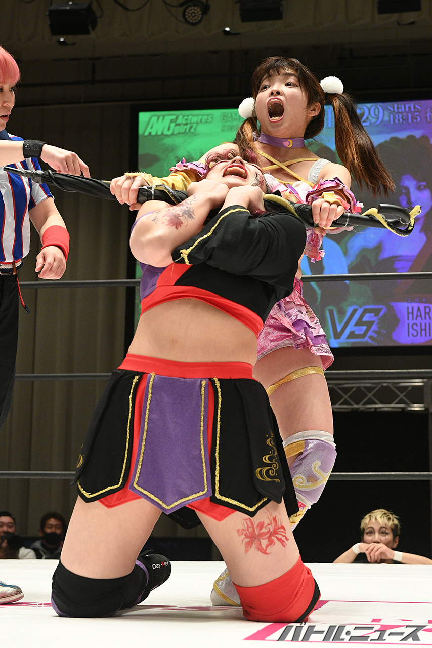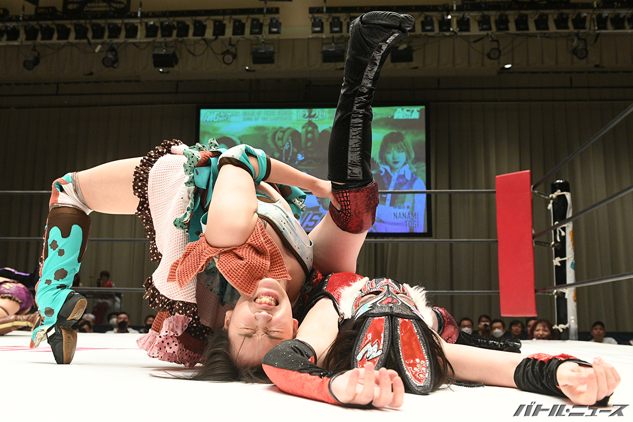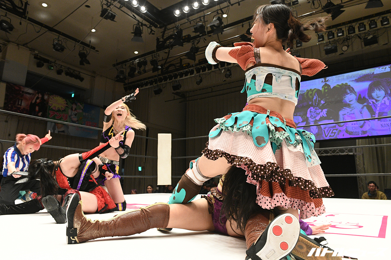 バニーは指を踏みつけていき、さらに指へのフットスタンプから手を握ってコーナーに登るとロープ渡り。だが菜々美が揺らすとバニーは落下しロープに股を打ち付け、リングに落ちたバニーに菜々美がドロップキック。菜々美はバニーを、ちいがヒナタを変形バタフライロックで捕らえエアギター。さらに菜々美は丸め込むも2。
