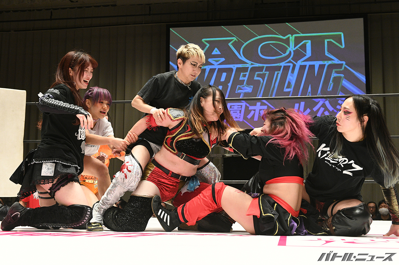「シングルベルト、悔しいけど、負けたよ。しかも3カウントで負けたのは、悔しいけど、まあ莉子の成長を肌で感じて、まあそれはちょっと敵だから言いにくいけど、まあちょっと嬉しかったかな。あと、キラーズが、私が負けたことによって暫定とかあるけど、キラーズが1本もベルトを失ってしまったので、キラーズをどうしようか、ボスとして考えてます。でも、アクトレスガールズをどんな形であろうと、絶対にめちゃくちゃにして、引っ掻き回してやります」