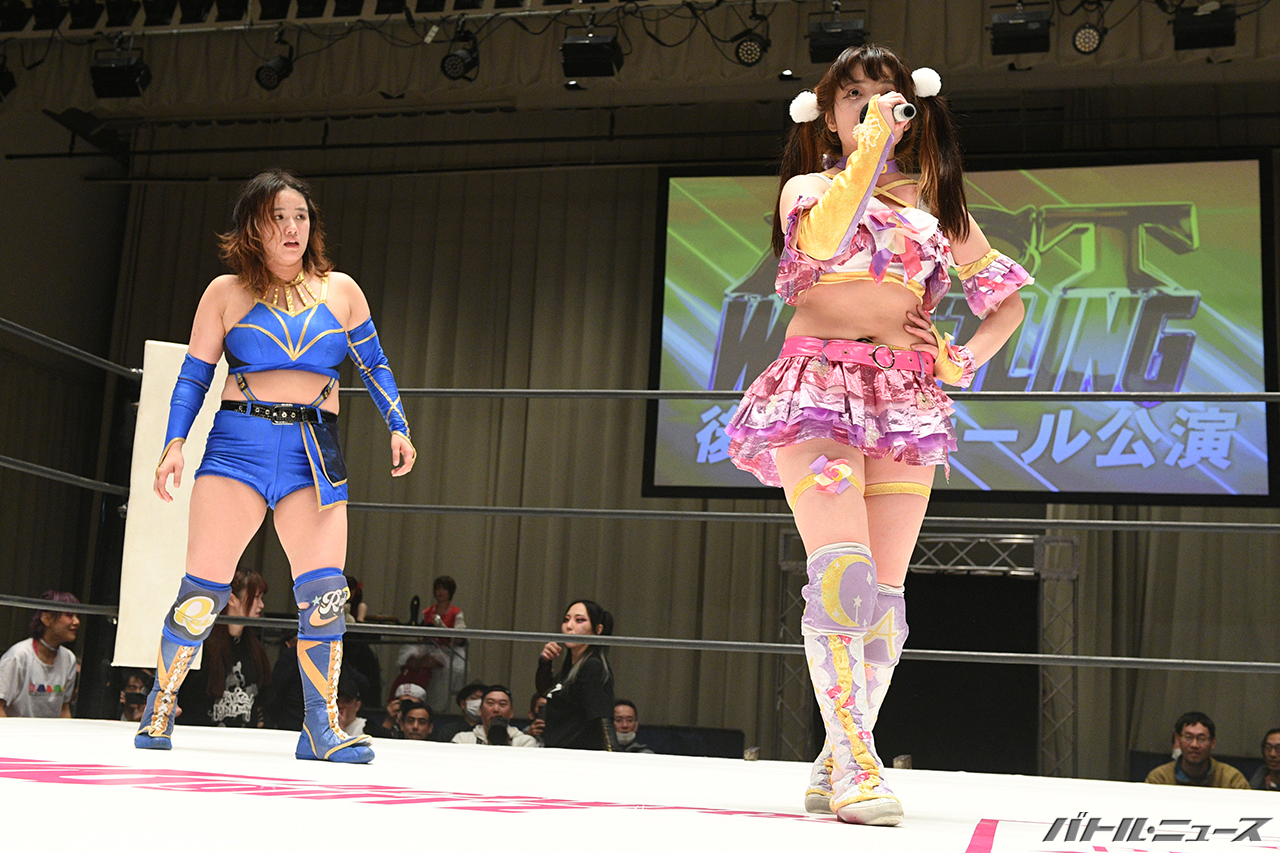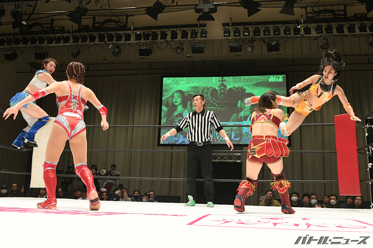 ゆきながなぎさを、茉莉乃が夏葵をコーナーに振って走り込むが、夏葵がブーメラン延髄切り、なぎさがダイビングダブルチョップで迎撃。さらになぎさがスライディングダブルチョップ、夏葵がランニングニーで場外に叩き出し、夏葵がコーナーに登ると場外へのプランチャを投下する。