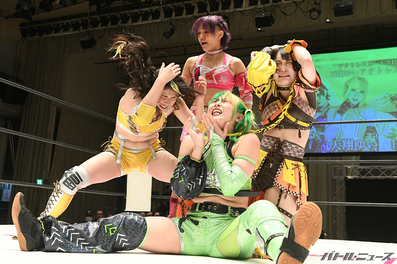 ゆきなはバックドロップを狙うが、耐えた夏葵が足への低空ドロップキックから足へのフットスタンプ。さらに足へのサッカーボールキック連発からロープに飛ぶが、茉莉乃が走り込みジャンピングフォアアームで迎撃。なぎさが茉莉乃にフライングダブルチョップを叩き込み、ゆきながなぎさの後頭部にカカト落とし。夏葵がゆきなにジャンピングニーを突き刺し、なぎさがゆきなにストンピングから真夏の汐風でサンドイッチ攻撃を狙うがゆきなが避けて夏葵のジャンピングニーがなぎさに誤爆。茉莉乃が夏葵にミサイルキックからサンドイッチハイキックを叩き込み、ゆきなが投げようとするが夏葵が耐えるとエルボー連打から首固めも2。