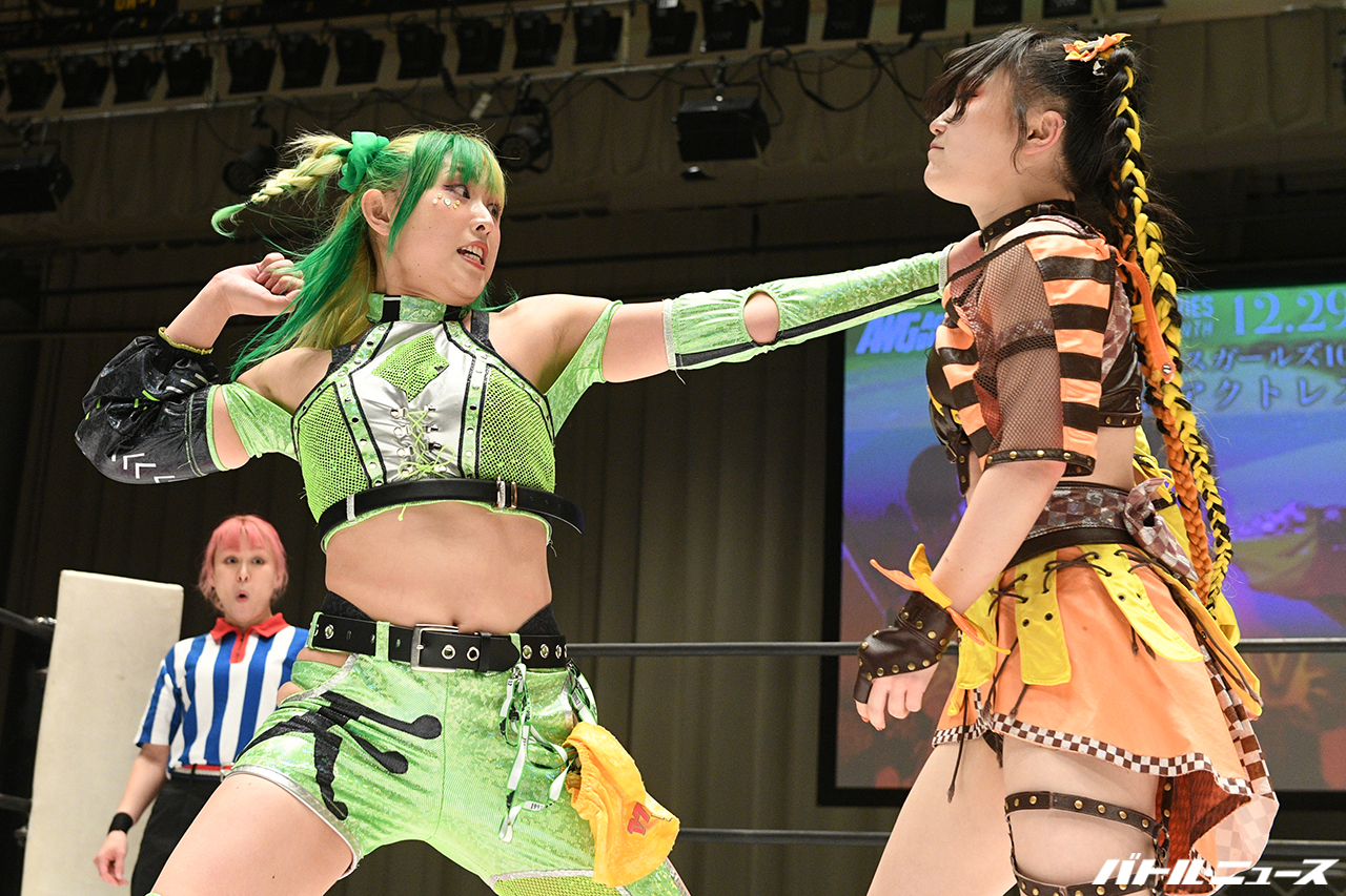 先発は茉莉乃となぎさ。リストの取り合いから茉莉乃がヘッドロックで捕らえ、なぎさが突き飛ばすも茉莉乃はドロップキック。なぎさがすぐに立ち上がり睨み合う。両者タッチ。