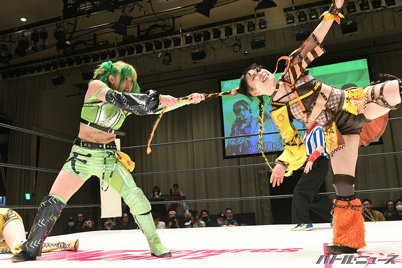 茉莉乃がコーナーに登るがなぎさがチョップで落としエルボー連打から夏葵がバックを取って足をロープにのせ、なぎさがコーナーからダイビングダブルチョップを茉莉乃の腹に叩き込む。さらに夏葵がフットスタンプを投下するが、ゆきなが夏葵にニールキックを叩き込む。
