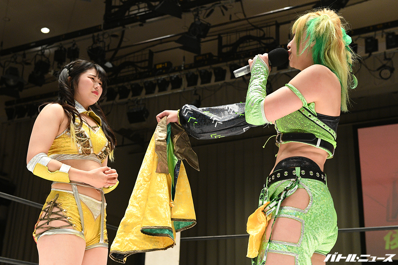 茉莉乃「キャッチーでいいんじゃないかなと思うので、皆様是非ともね、これからこの2回防衛したということは、本当にまずはアマテラスを倒すまで、暫定から第2代タッグチャンピオンになるまで、どんどん闘っていかなあかんなと思ってます。どんな感じで誰が来るかが、会社が決めるというか、黒幕が決めてるので、ちょっと私たちにはわかんないんですけども、とりあえずそれまで防衛できるように、アマテラスを倒すまで防衛できるように頑張りたいなと思ってます」