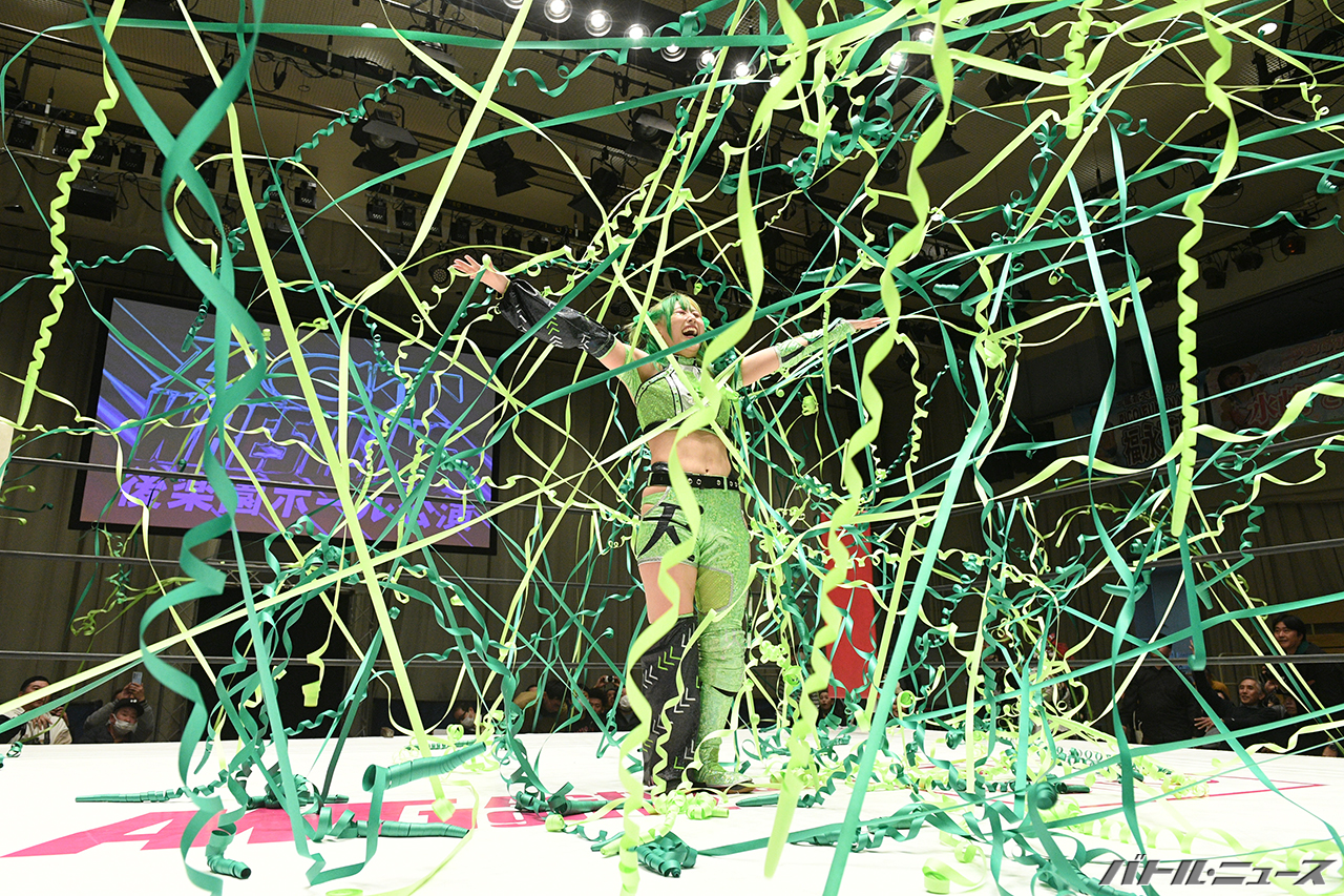 ゆきな「すごいデビュー前から色んな方に期待していただいた分、不安もあったんですけど、その気持ちにも答えたかったし、何より自分に負けたくなくて、がむしゃらに、前向いて、追い込んできた1年でした。いつも応援してくれてるみんなに、恩返しがずっとしたくて、今日後楽園のメインで、茉莉乃さんと勝てた事で、少しは、少しだけは返せてたらいいなと思います。真夏の汐風に勝ったということは、暫定チャンピオンというより価値があるんじゃないかなって私は思うんですけど、皆さんどうでしょうか?」