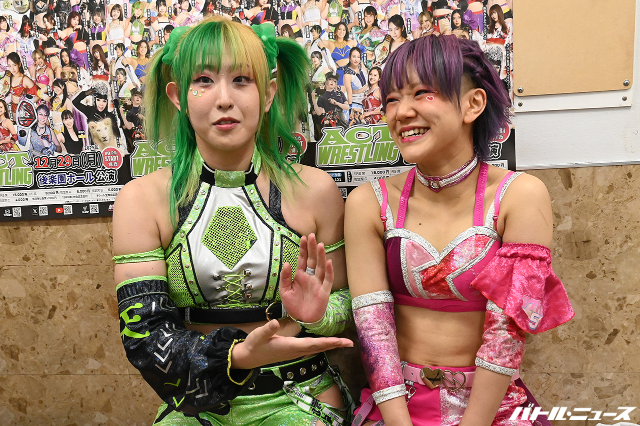 「いや、なんかちょっとありましたよ。いやAWGシングルベルトがアクトレスガールズの最高峰だから、いやメインじゃないの?とも思ったけど、うんまあでも、そのメインよりいい試合すればいいなって、それだけだなって思ったんで、ちょっとそういう気持ちもありつつも、でも2025年の最後の、まあね?アクトレスリングの試合ということで、華やかに終わった方がいいかなって思いました。だからまあちょっと思いましたけどね。でもまあ、でもまあそれはそれでなんか別に私はそんなことよりっていう、結果の方がって感じなんで。楽しみにしてくれてるお客さんもね、2人と4人でまた違うし、いいんじゃないかな。華やかに終わって今年一年って思いました」