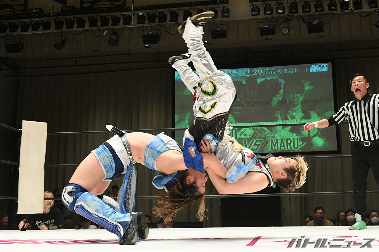 莉子はローキックからソバット。さらに逆の足でのソバットからバイシクルキックを突き刺し、バズソーキックからタイガースープレックスを狙うが、耐えたMARUにハイキック。改めてタイガースープレックスホールドで3カウントを奪った。