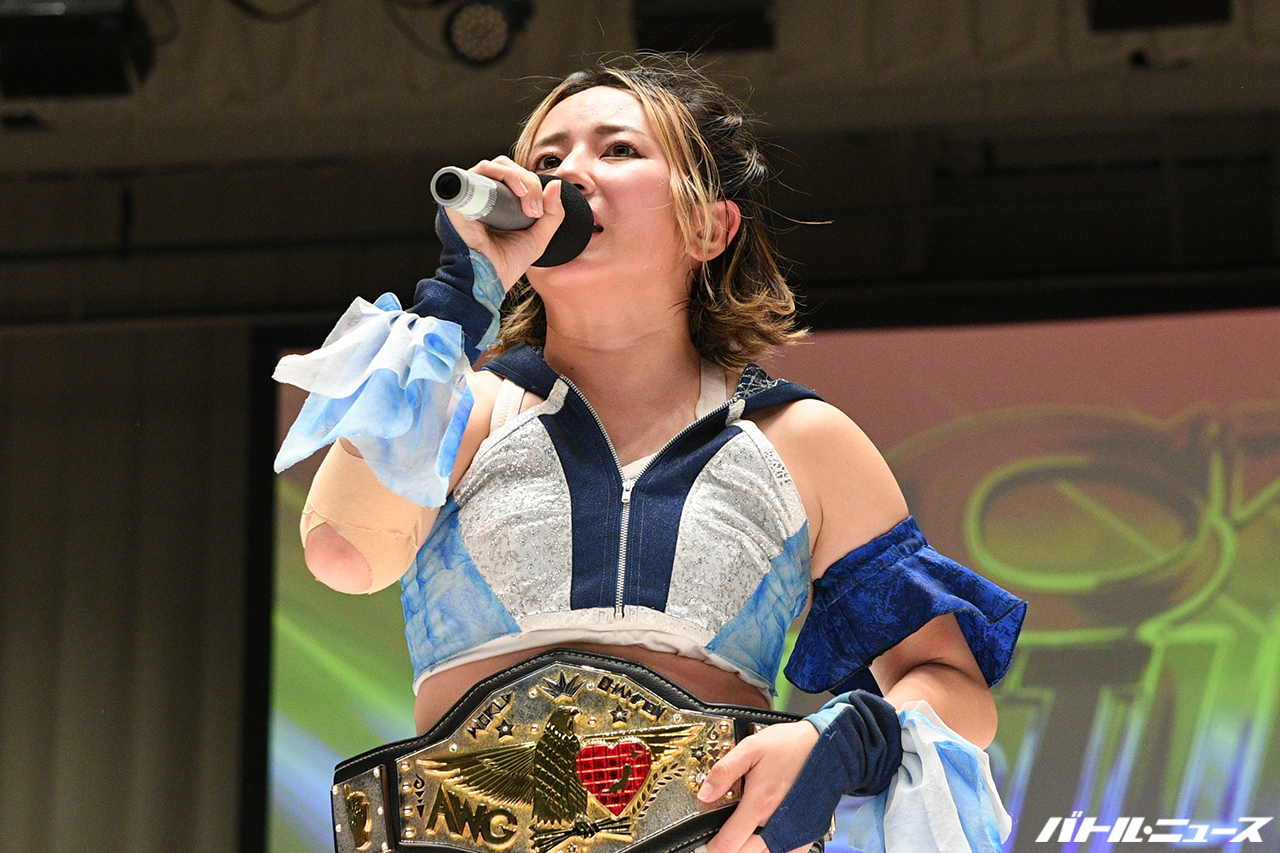 「ありがとうございました。後楽園ホールで初シングルマッチでした。まさかタイトルマッチをかけて初めてのシングルマッチをすることができるとは思わなかったので、もう最高にもう最高の景色でした。そして12月20日に、このAWGシングルベルトをとったんですけれども、まさか9日後に初防衛戦になると思わなくて・・・なんか、もう年末にとったのに、なんかまた落として、ね、すごいもう上げて下げられる。で、もうそんな年越しになったらどうしようかなって思ったんですけども、皆さん、守りました!AWGシングルベルト。なんか今年、MARUさんとすごい、なんかもうMARUさんに追いかけられた記憶しかなかったなって感じなんですけども。いやでも、MARUさんと2025年最後もうバッチバチにやれて最高に楽しかったです。また来年も、まあいいや、ちょっと来年はやりたくないですね。MARUさんとはね。はい。ほら次、今日寧々とさくらがね、シングルマッチして、さくらが勝ったということで、次、私とさくらの、このベルトをかけて戦います。ちょっといつになるかわからないんですけども、まあ私の気持ちとしては、まあ、近いうちにやりたいなっていう感じでね。もうどんどんどんどん、もう戦ってね、間が空かないぐらい戦ってですね、最多防衛狙っていきたいなと思います。今年一年、皆さんありがとうございました。来年ね、なんか今日の後楽園ホール、少なかったですね。それが悔しくて、来年は後楽園ホール、満員になるぐらい私がエースとして盛り上げていきたいなと思います。皆さん、来年もアクトレスガールズをよろしくお願いします。ありがとうございました」