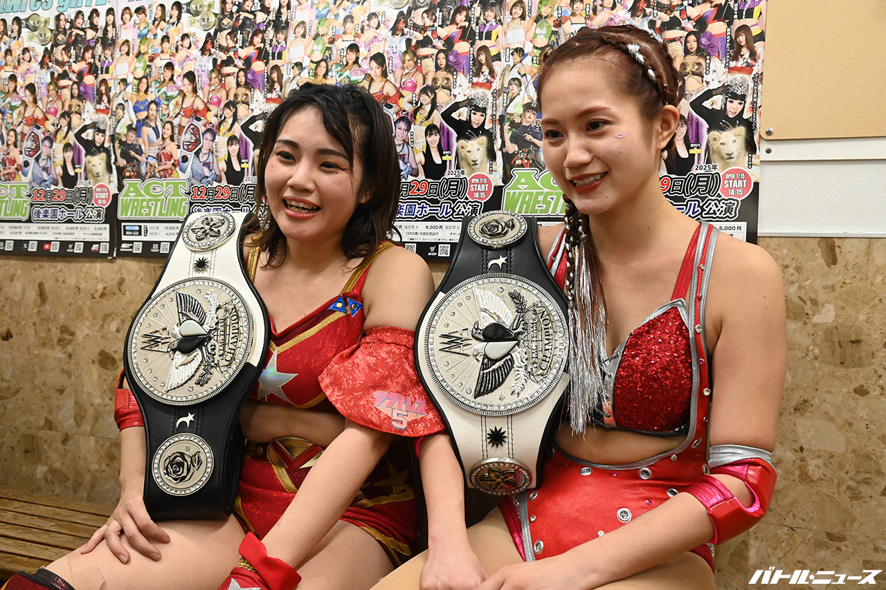 「なんか正直、ベルトを取るってなった時に、ちょっと実感がなかった感じもあるんですけども、でもなんかこう、私の精神的になんかすごい落ち着いてて。取るなって気持ちはしてて。で、やっぱり実際ここにね、私の腰にベルト巻かれてから、なんか違いますね、世界が。なんか気持ちもね、もうちゃんともっと頑張らなきゃっていうね、気持ちになりました。まあ、アクトレスガールズを背負うってこういうことなんだなって思ったので、はい。まあ、なんかまあ最高だなって感じですね(笑)私の弟もベルト持ってまして、はいなんかちょっとこう姉弟でベルト持てる人生最高だし、もうこのベルトがもうやっと私のもとにね、あるべき場所に来たなっていう感じですね」