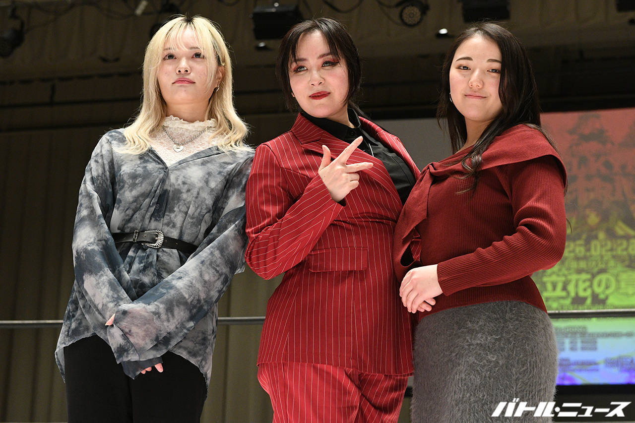 先発は摩利乃と彩乃。ロックアップも彩乃は微動だにせず、絵梨沙が摩利乃の後ろについて二人がかりで押し込もうとするが、茉莉が彩乃の後ろについて一気にロープに押し込む。さらに茉莉がロープに飛んで二人まとめてバックエルボーで潰し、彩乃が摩利乃の髪を掴んで正面ロープに押し込み、茉莉もその下で絵梨沙へロープを跨いだチョーク攻撃をしながら彩乃とともに「まぁちゃんデビューおめでとう!」と祝いながら痛めつける。