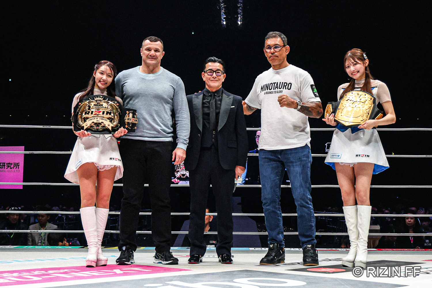 ミルコ「コンバンハ、ゲンキデスカ?さいたまスーパーアリーナは私のスポーツキャリアで素晴らしい思い出がたくさんある場所だ。戻ってこれて嬉しい。19年前この場所で僕はベルトを持っていなかったんですが初めてPRIDE GP無差別級のベルトをとりました。それから10年経って、RIZINの2年目にRIZIN無差別級GPのベルトをとりました。僕にとって人生、血と汗がかかった2本のベルト、今日皆さんに見せられて大変光栄です。さいたまスーパーアリーナが自分にとってどれだけ思い出に満ちた場所であるか、改めて今日来て思いました。今日皆さんと一緒に最後まで楽しみたいと思っています。皆さん良いお年をお迎えください。ハッピーニューイヤー」