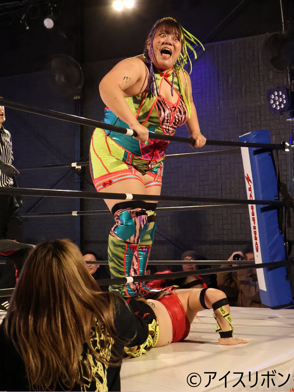 代わった愛梨紗がコーナーにりこをぶん投げての踏みつけから客席に新年の挨拶。さらにはりつけボディアタックでカバーもカウント2。