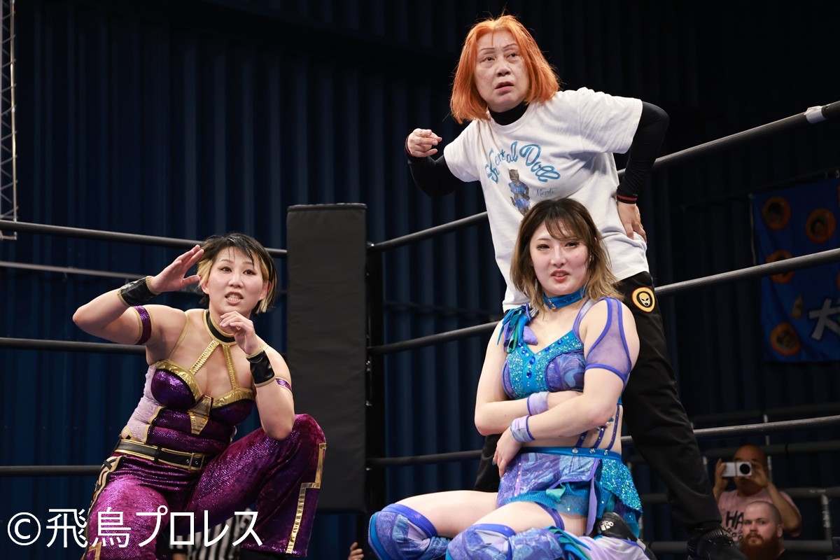 “新生”飛鳥プロレスが1月7日、東京・TOKYO SQUARE in ITABASHIで『飛鳥プロレス 新春大会』を開催した。『まこみおバリューセット』(真琴&紫雷美央)が『1,111円』(神姫楽ミサ&柳川澄樺)を破り、次回大会(3月29日、川崎・ポスト・ディ・アミスタッド)で美央&松澤さんがしのせ愛梨紗&柳川と対戦することが決まった。
