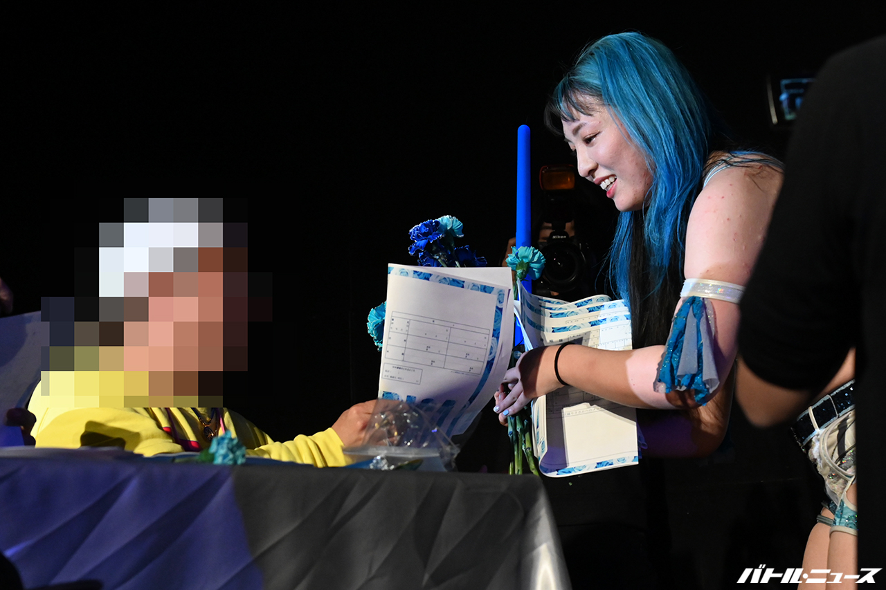 花束と大量の婚姻届を受け取り苦笑しながらリングに戻った世羅は、不倫されて2023年に離婚した事をいじってくるウナギをライトセーバーで切り捨て勝利した。