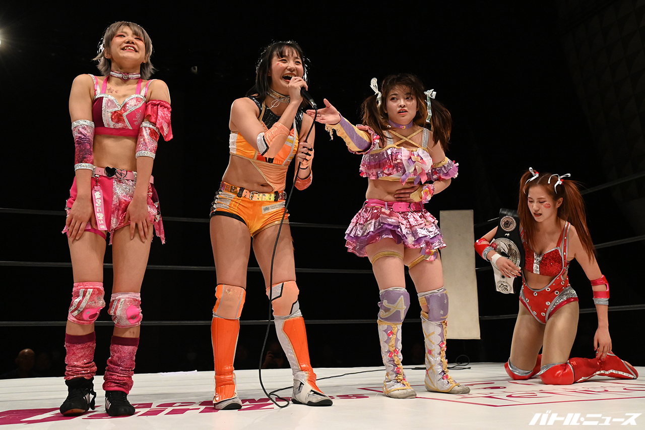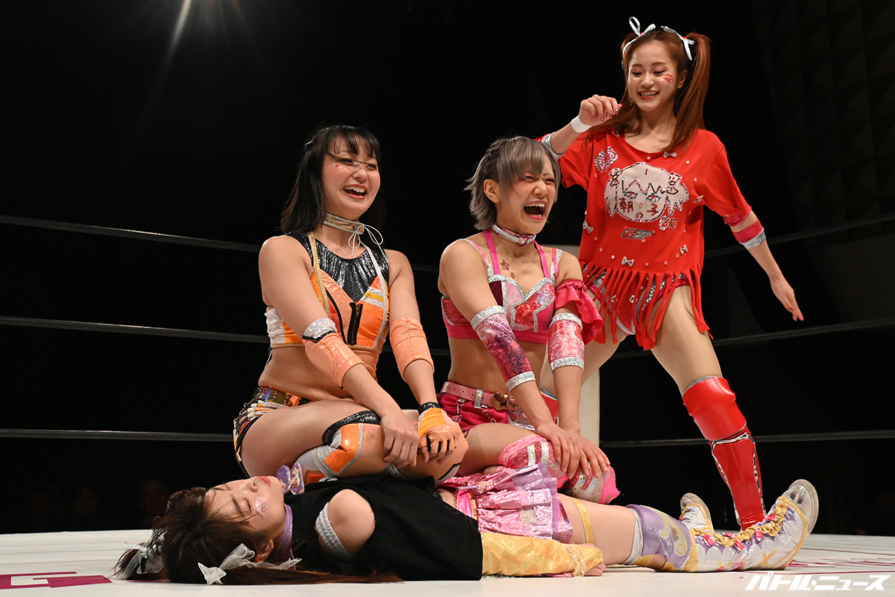 MARUは再度コーナーに登るが茉莉がハイキックでカットし、MARUを担ぐとバックフリップ。そこへはるかがダイビングセントーンを投下し、フォールも杏加がカット。