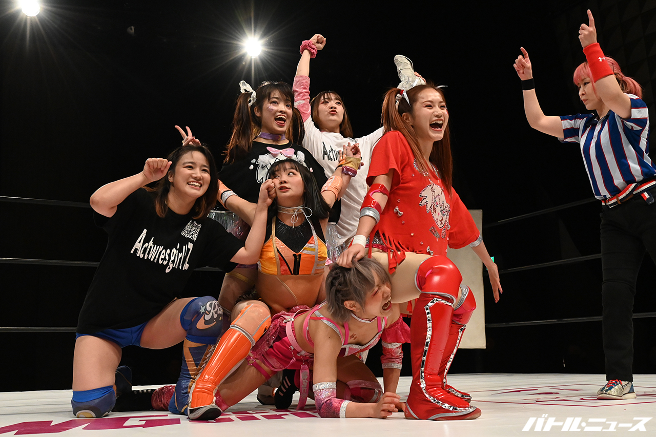 茉莉乃と梨央はエルボーの打ち合いから梨央がロープに押し込みチョップ連発。茉莉乃が切り返してエルボー連発からかなとともにアクトレス5のダブルドロップキックを狙うが彩乃がカット。