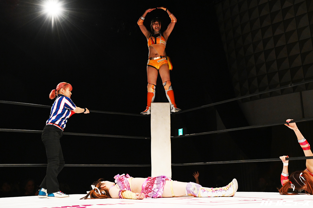はるかが引き起こすもMARUがスタナー。さらにセカンドロープからのダイビングフットスタンプから、杏加がダイビングニードロップ。さらにMARUがトップロープからのダイビングフットスタンプを投下しフォールすると3カウント。