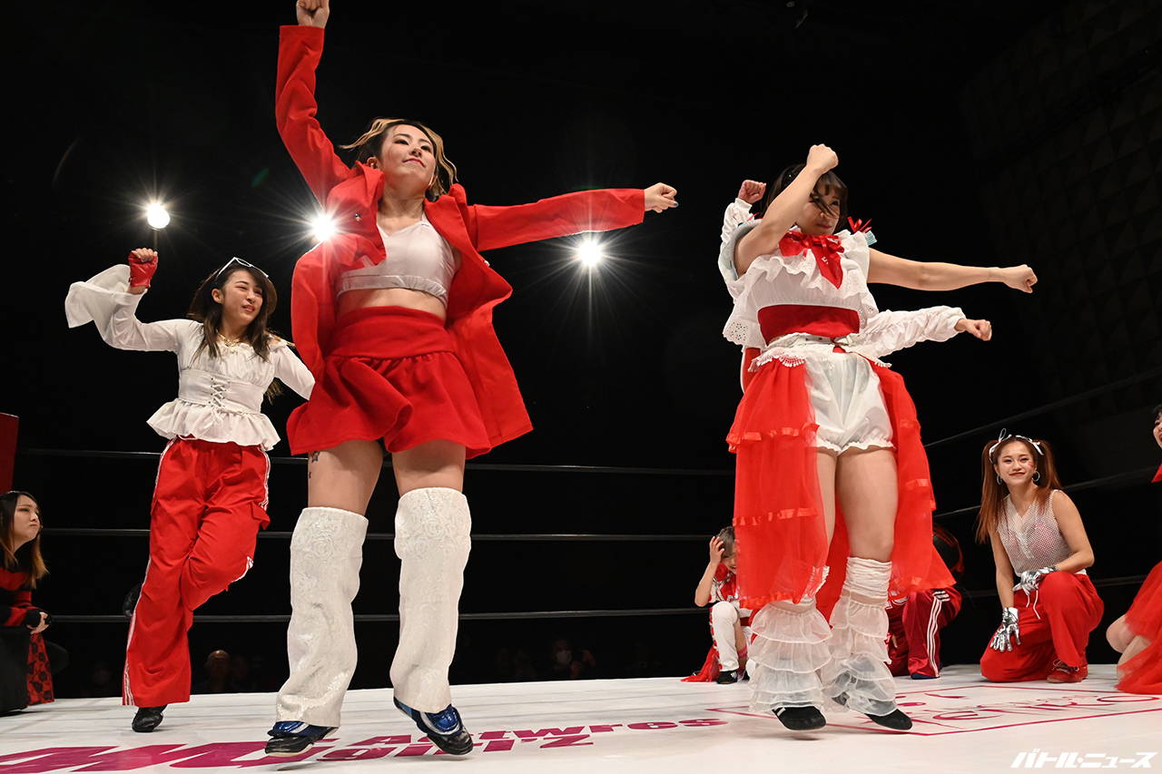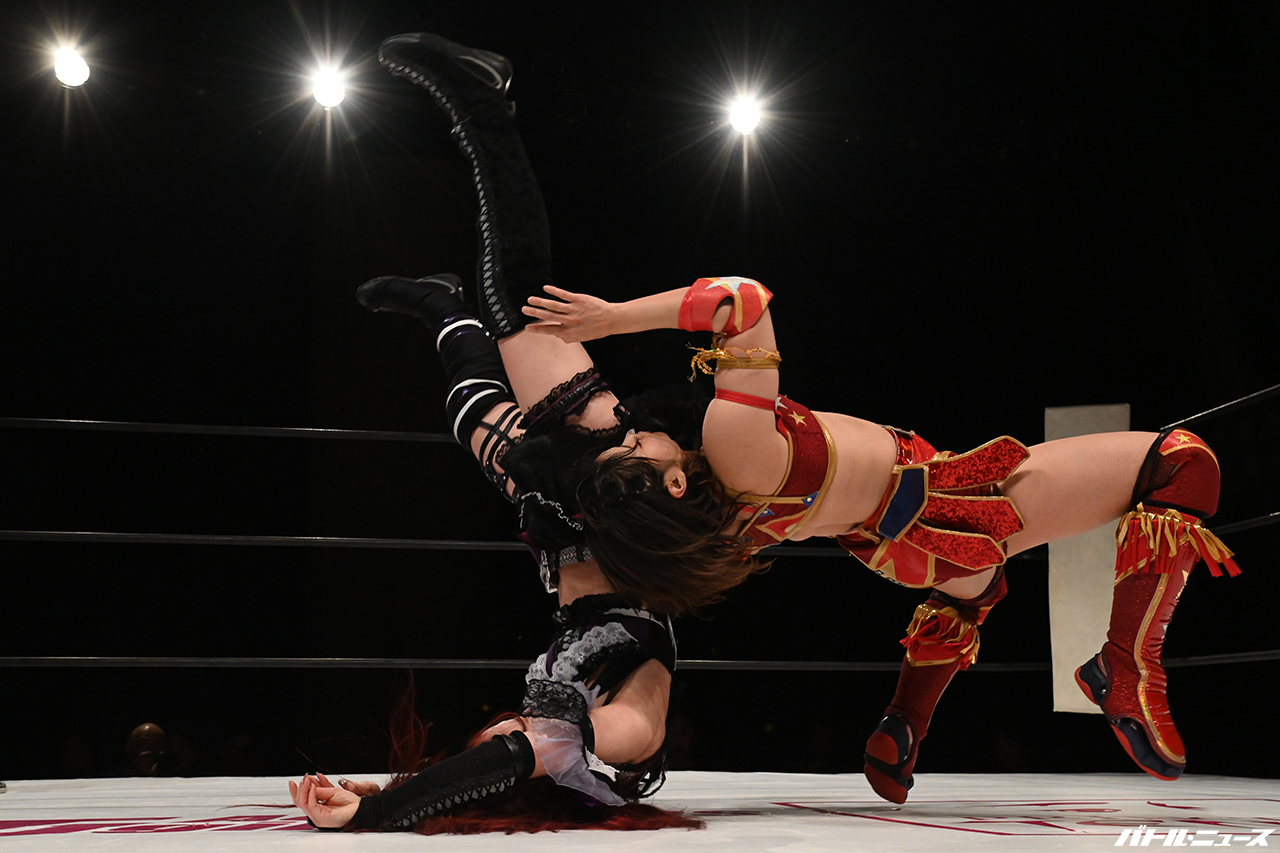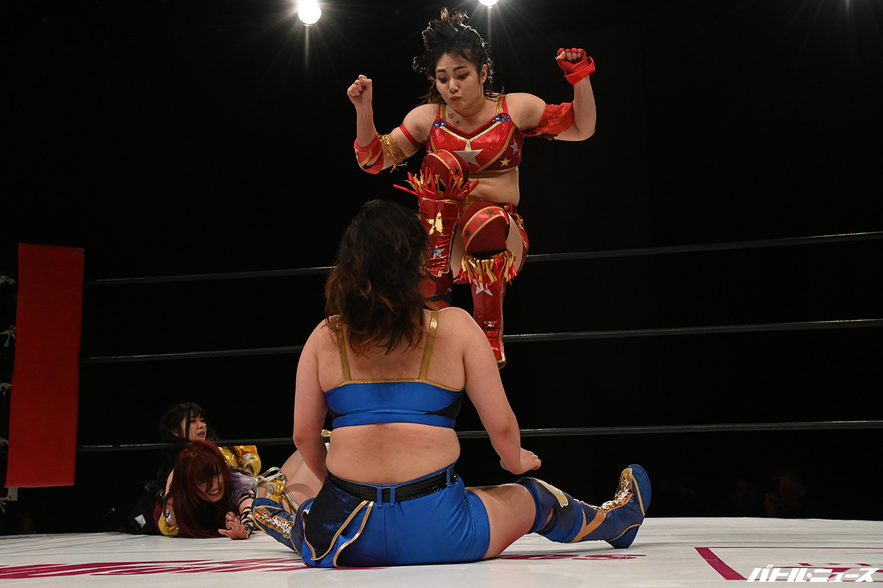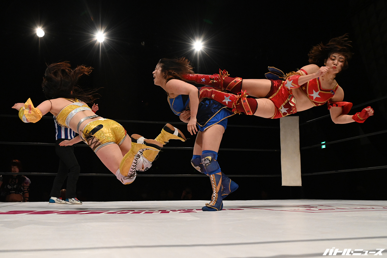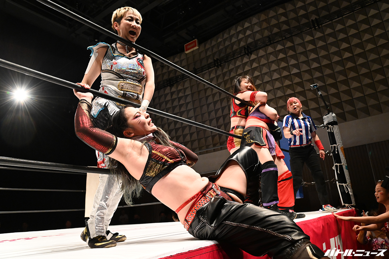 茉莉乃は引き起こすが梨央がエルボーを叩き込み、コーナーに振って走り込むが、茉莉乃が避けると彩乃を梨央に叩き込み串刺しドロップキック。彩乃が避けて梨央にだけ突き刺さり、彩乃はロープに飛ぶが茉莉乃はドロップキックを突き刺して倒す。