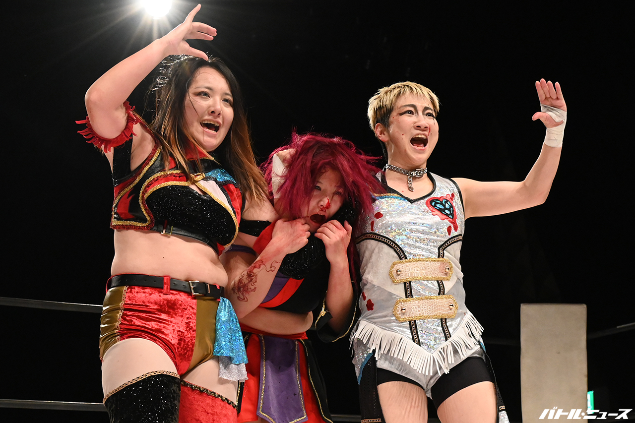 MARUをそっちのけで杏加とはるかはマウントエルボーの応酬も、MARUがカットして杏加とともに蛇道衆ポーズを決めてダブルのスタナー。