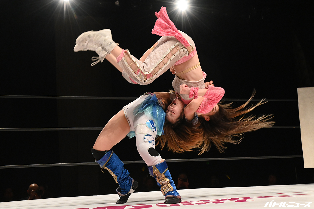杏加は担ぐが着地したはるかがショートレンジラリアットでなぎ倒し、再度ショートレンジラリアットも避けた杏加が顔面への膝蹴り。杏加が担ぐとデスバレーボムからフォールも、2で髪を掴んで引き起こし、エルボーの打ち合いから杏加がラリアットを避けての河津落とし。さらにロープに飛んでのギロチンドロップを投下するが、避けたはるかが背中への低空ドロップキックからヨーロピアンクラッチも2。