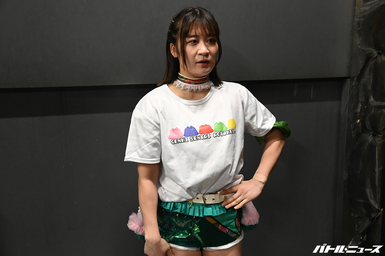 「莉子とのベルト戦はKING戦以来ということで、KING戦が初のシングルマッチで、次が今回2度目のシングルマッチでまたベルト戦ってことで、こういう運命の相手なのかなっていう風に自分の中ではあったし、でもだからこそ、この前勝った、この前ベルトを自分が防衛した、だから次私は莉子からベルトを取りたいって思っていたんですけれども、ポイントマッチということで、いろんなポイントの結果、莉子に負けてしまいました。でも、そうですね。ほんと悔しい。悔しいけど、その莉子がもうなんかめっちゃ強くて、なんかリングの上で味わう緊張感とかがKING戦の時ともう全然違くて、やっぱそのKING戦から半年ぐらい経って、莉子がベルトとって王者になって、その莉子の強さをリングの上で感じた試合でした。自分ももっと強くなりたいという風に改めて思いました。応援ありがとうございました」