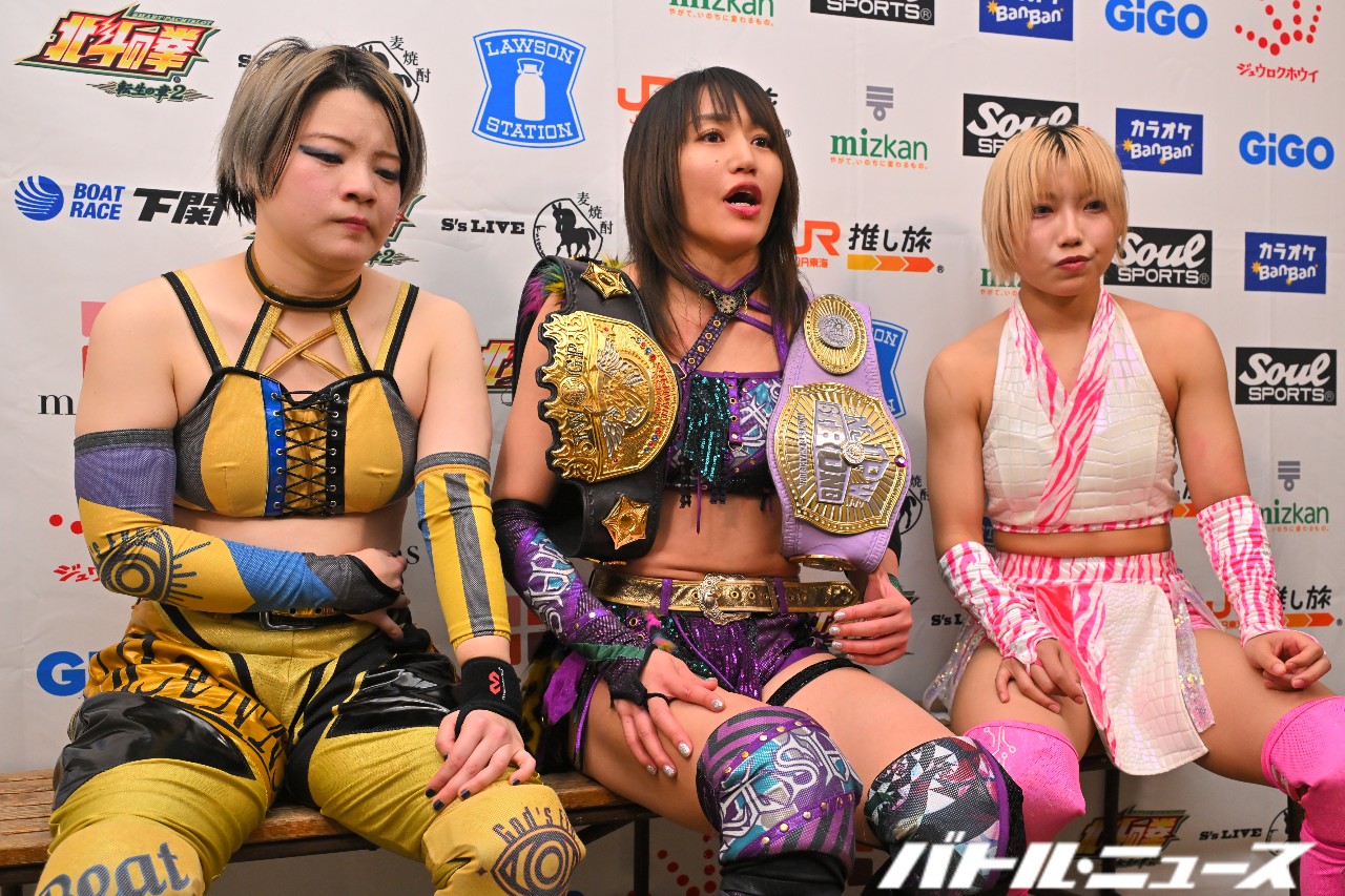 朱里らは沈痛な面持ちでバックステージに現れ、朱里が「今日沙希が引退発表をしれっと言って走って行っちゃったんですけど、自分自身話は聞いていました。すごく……しれっと言ってたけど、さみしい気持ちがすごくあるんですけど……本人はすごく考えて出した結果・決断だと思っています」と語る。