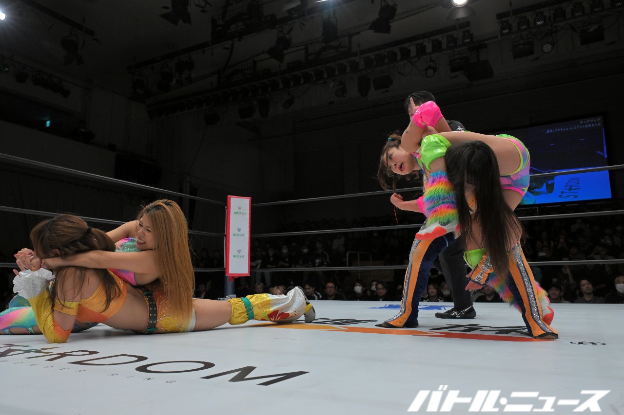 コグマの援護も得て勝利を目前まで引き寄せたあんねだったが、最後は葉月があんねのエルボーを巻き取ってのクロスフェイスで仕留めた。