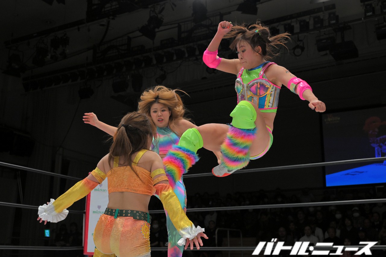 試合開始直後はコミカルな雰囲気に包まれていたリングだが、キャリアの近いあんねとの対面となるとシリアスな空気に。真っ向からエルボーで打ち合っていき、打ち勝ったあんねがボディスラムからコグマにタッチ。