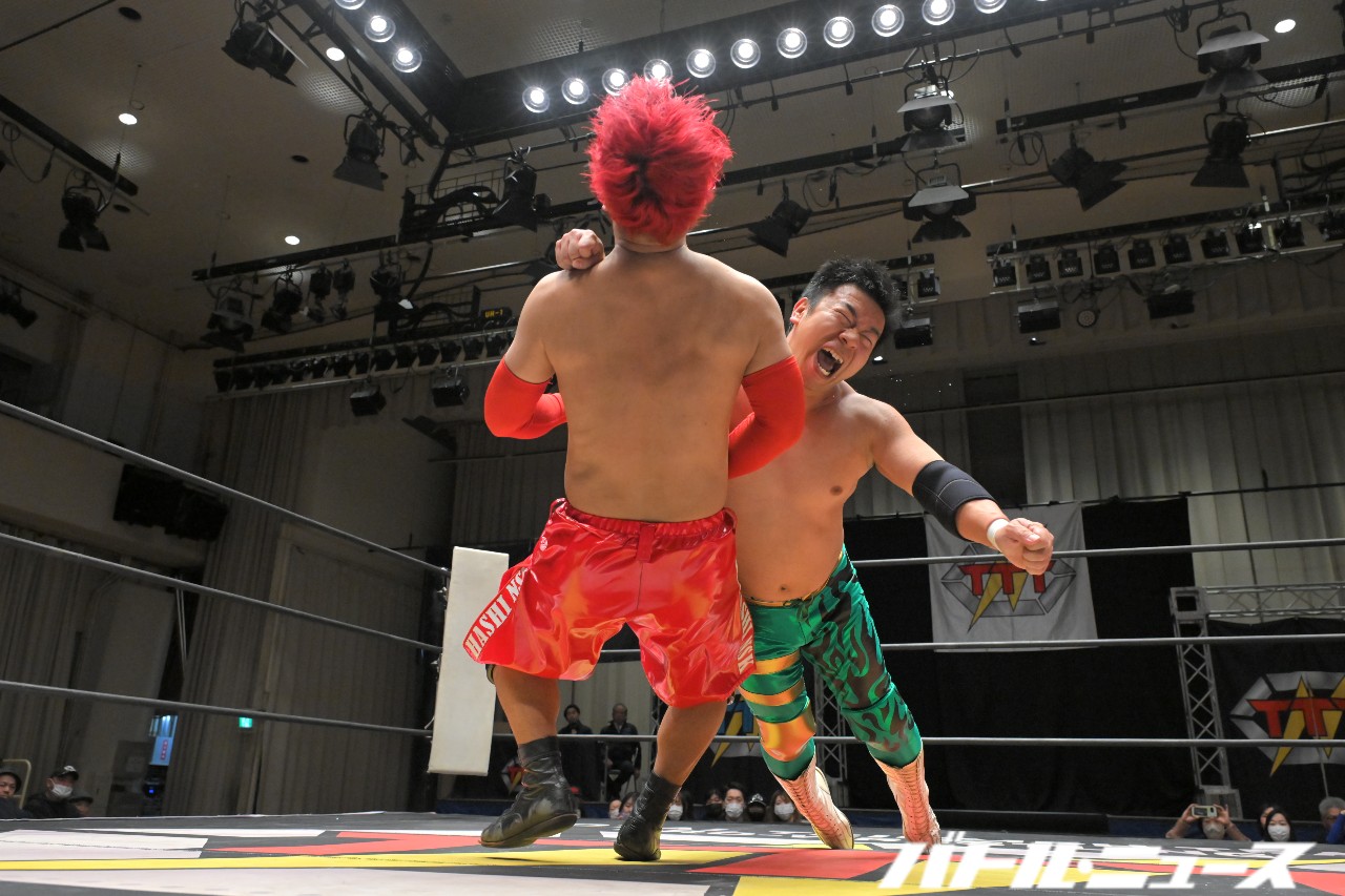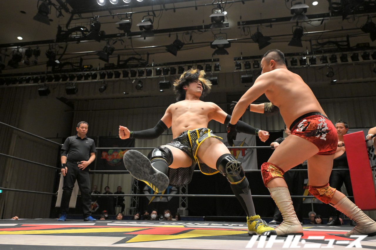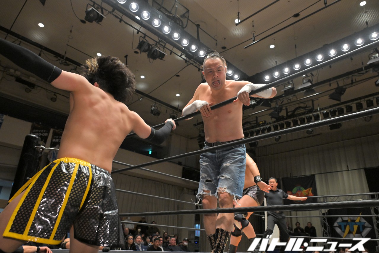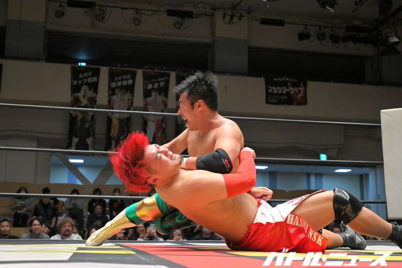 橋之介もエルボー連打で突っ張っていくが、ダイスケは逆水平チョップに切り替えて打ち返してロープに振るが、橋之介がハンドスプリングエルボーで反撃。さらに串刺しジャンピングニーからロープに飛ぶが、ダイスケがカウンターのドロップキックで反撃を断ち切る。
