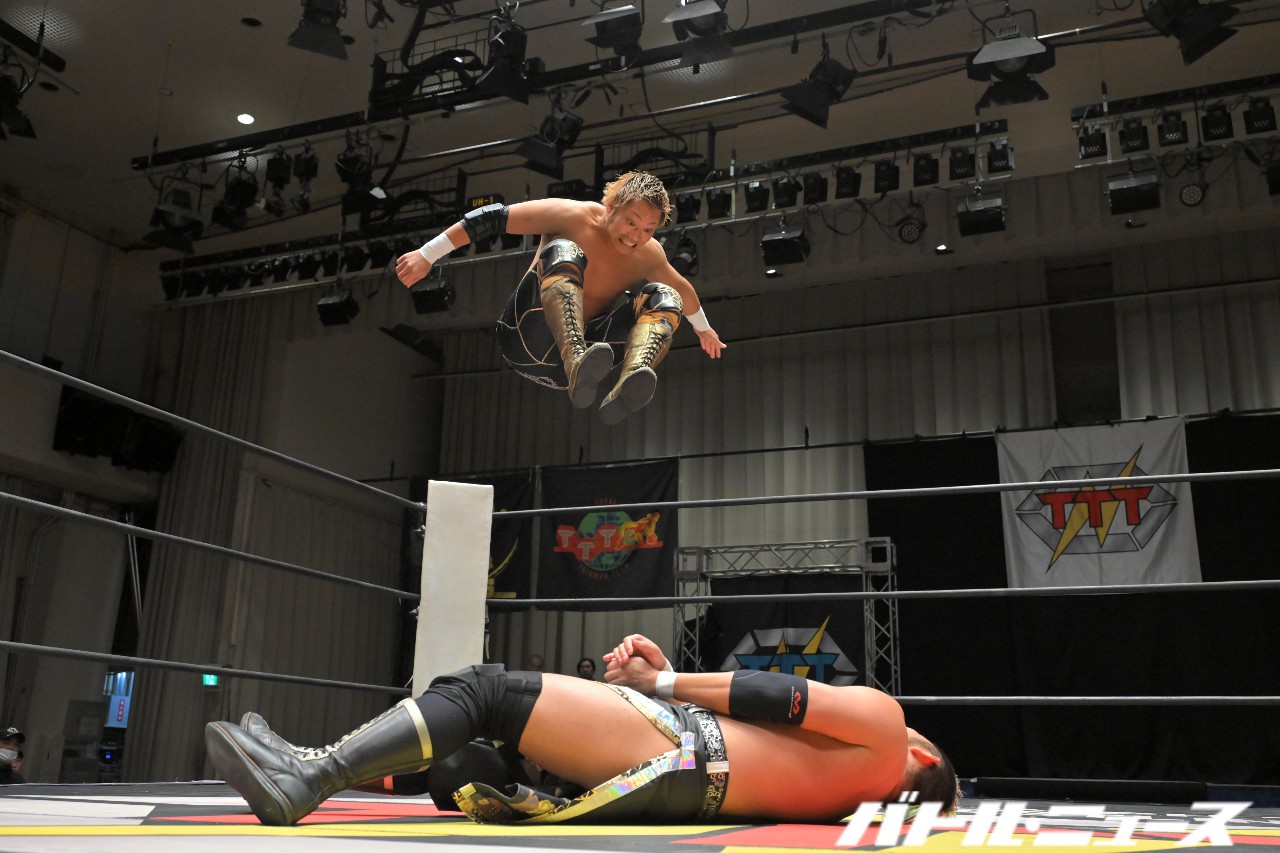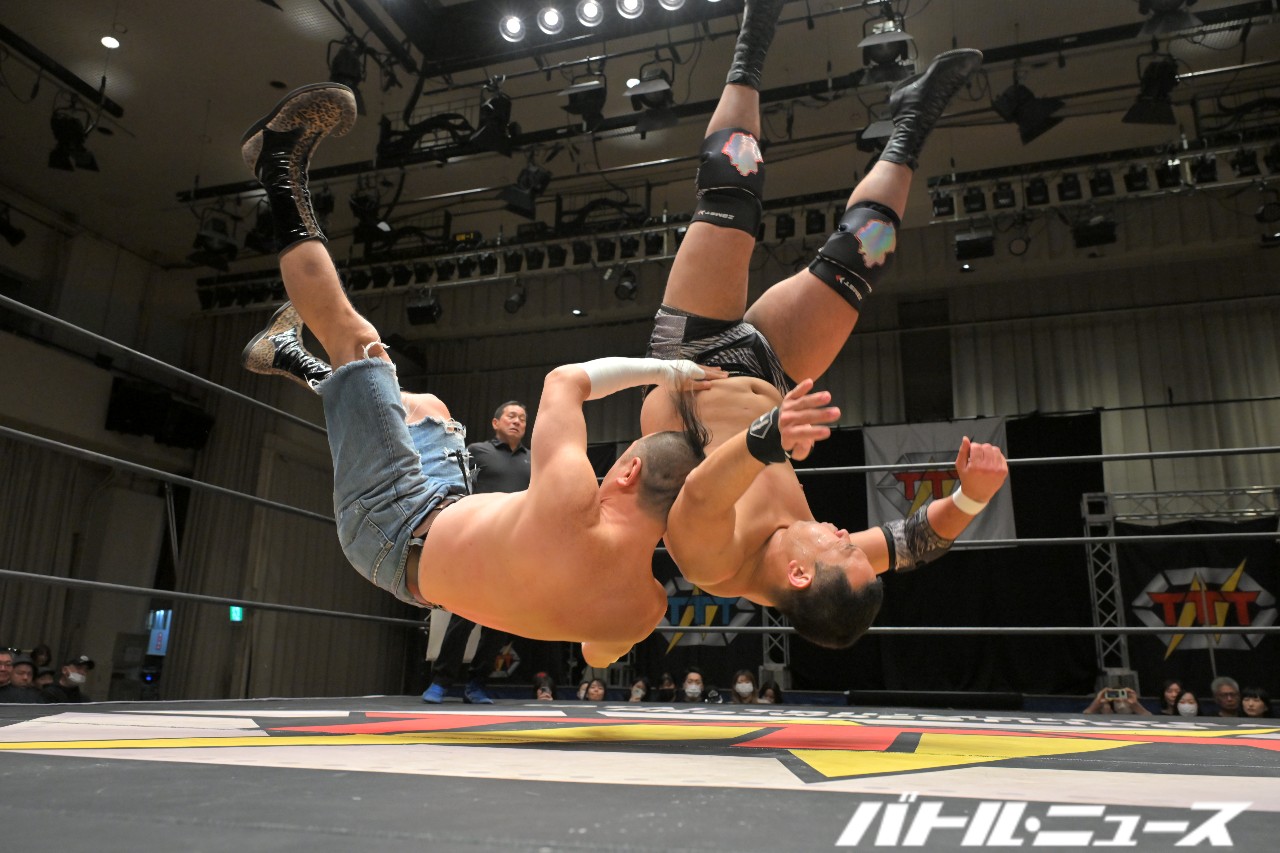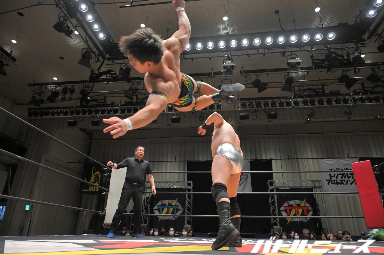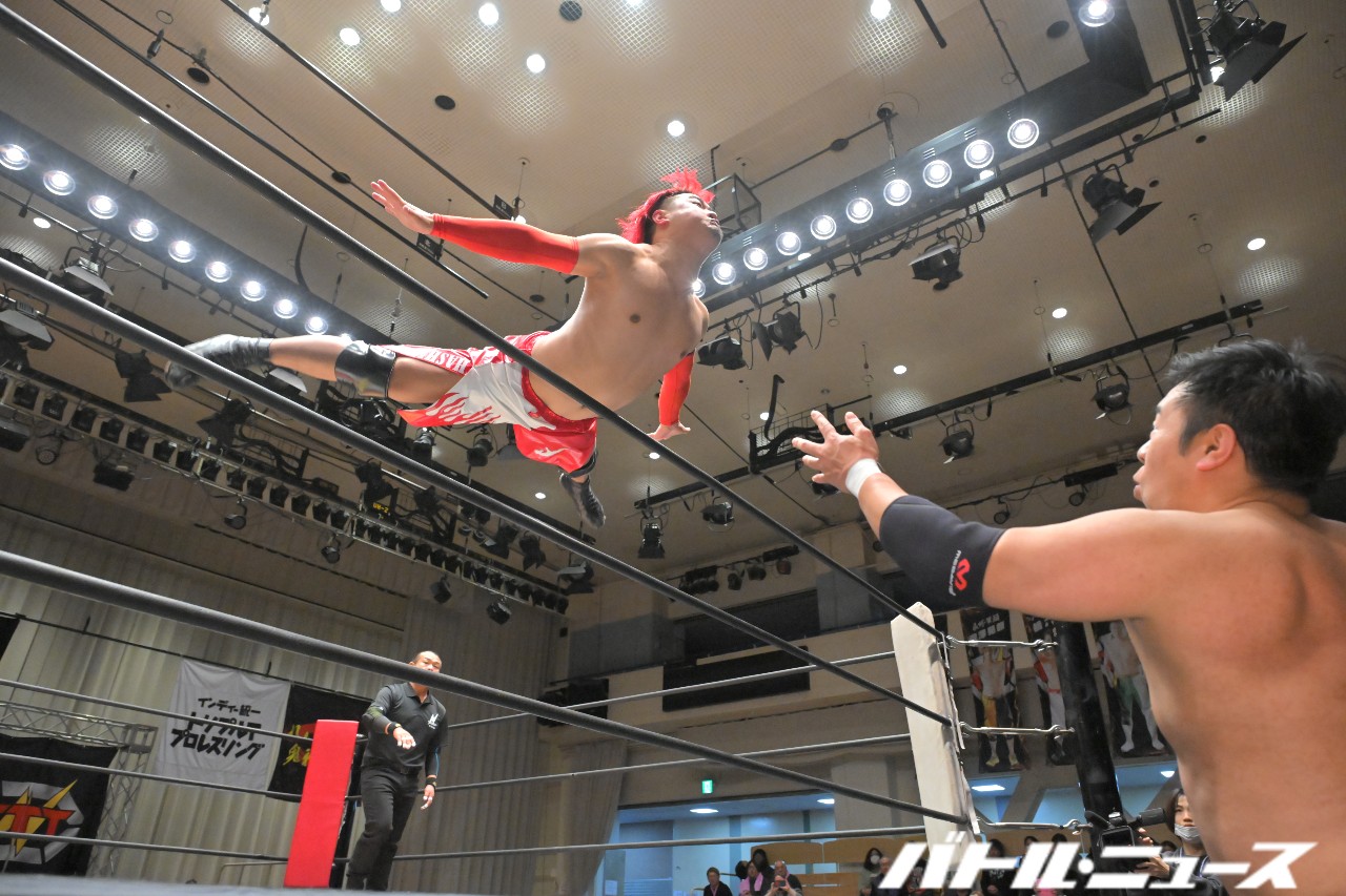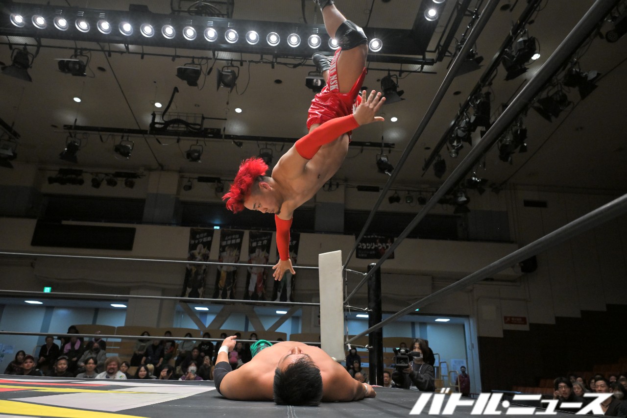 橋之介もエルボー連打で突っ張っていくが、ダイスケは逆水平チョップに切り替えて打ち返してロープに振るが、橋之介がハンドスプリングエルボーで反撃。さらに串刺しジャンピングニーからロープに飛ぶが、ダイスケがカウンターのドロップキックで反撃を断ち切る。