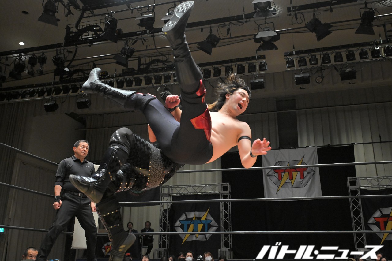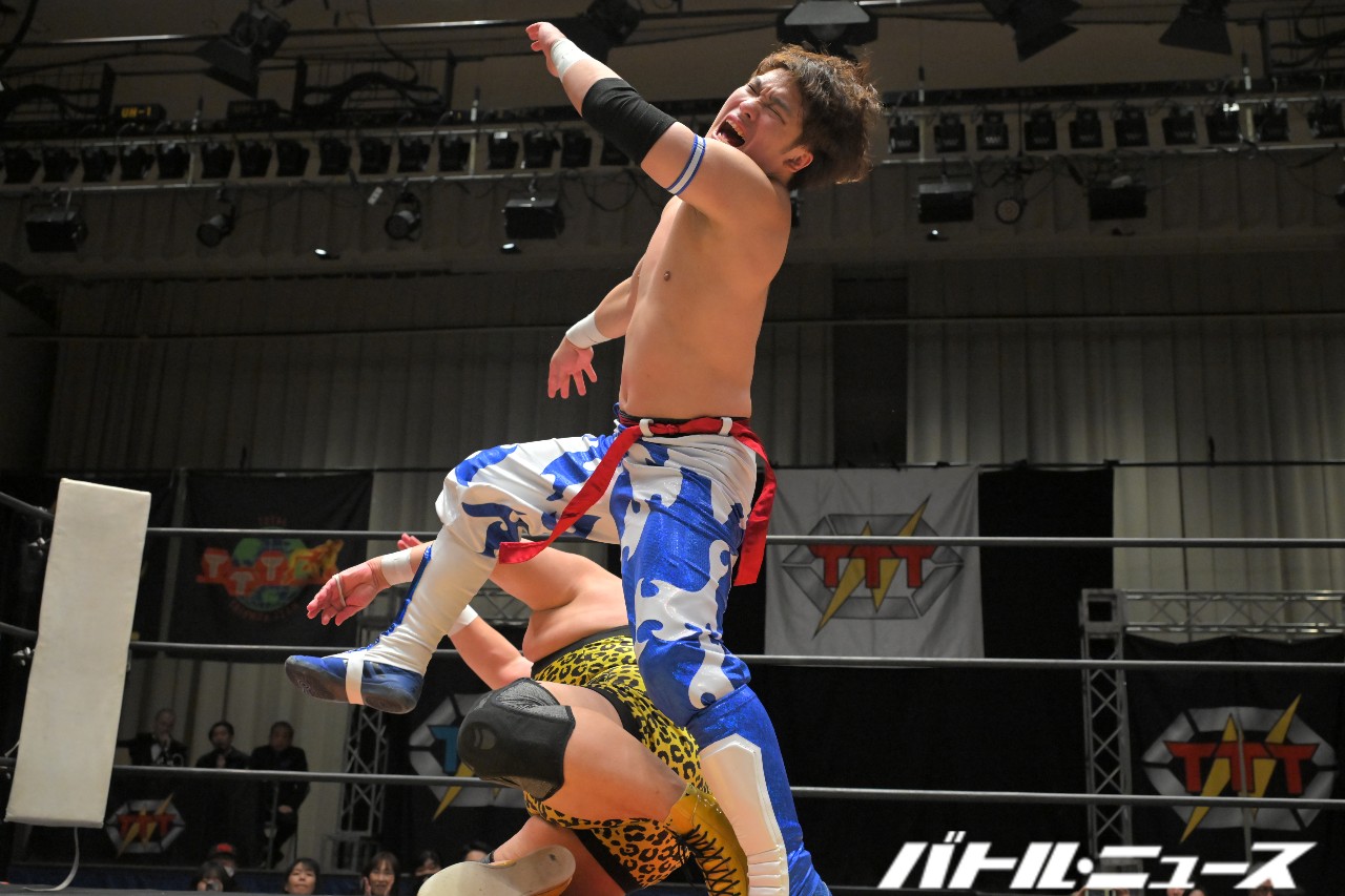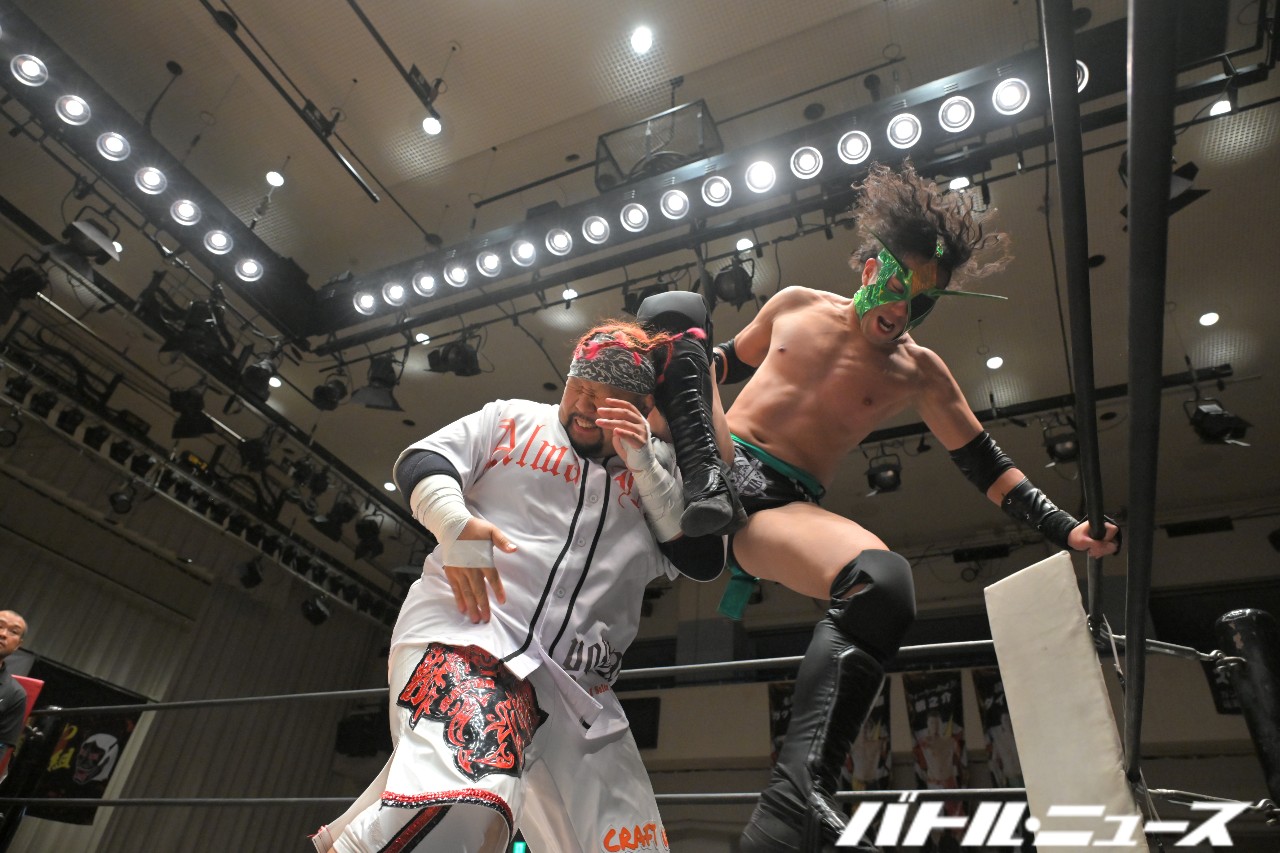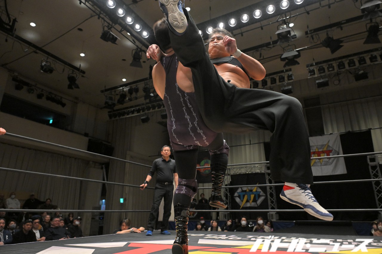 橋之介もエルボー連打で突っ張っていくが、ダイスケは逆水平チョップに切り替えて打ち返してロープに振るが、橋之介がハンドスプリングエルボーで反撃。さらに串刺しジャンピングニーからロープに飛ぶが、ダイスケがカウンターのドロップキックで反撃を断ち切る。