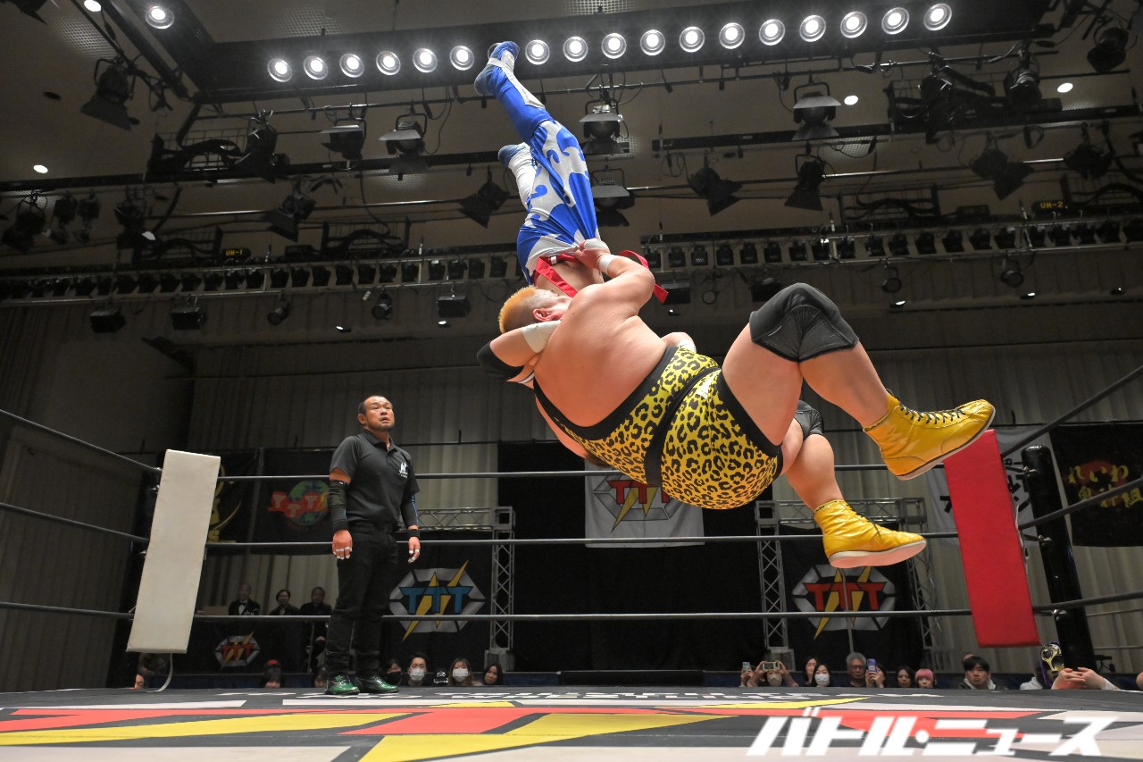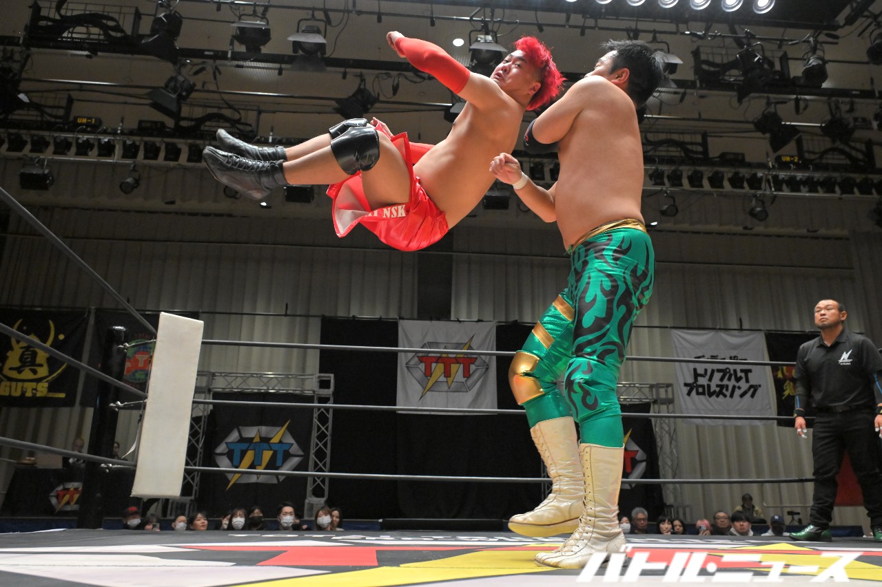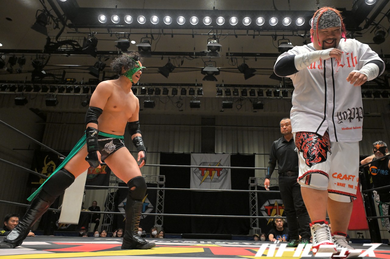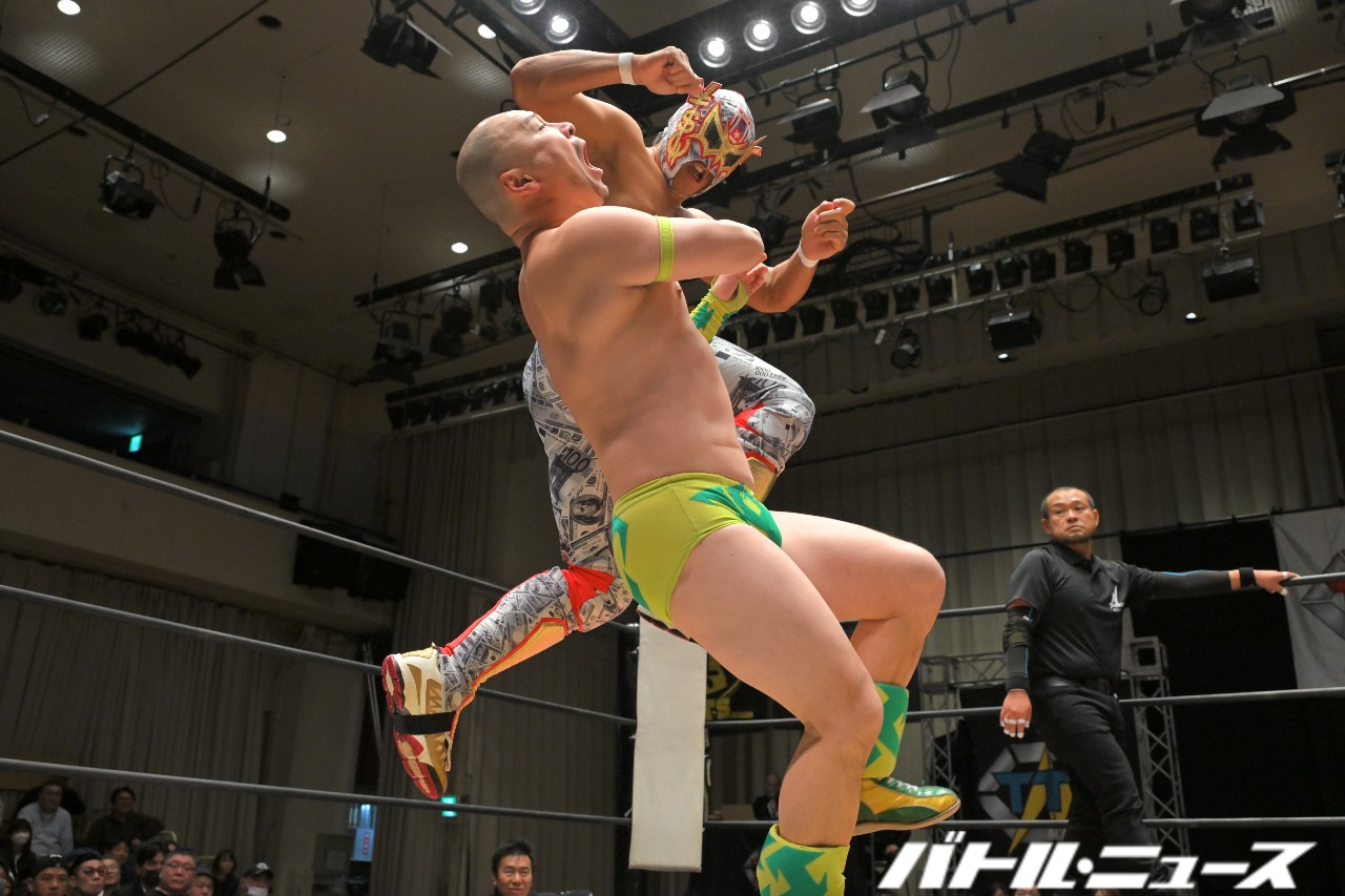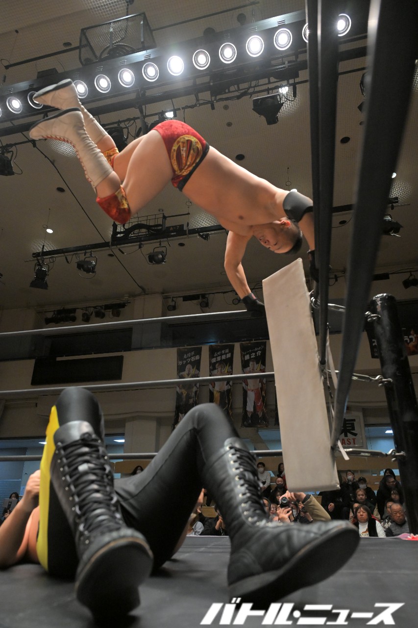 橋之介もエルボー連打で突っ張っていくが、ダイスケは逆水平チョップに切り替えて打ち返してロープに振るが、橋之介がハンドスプリングエルボーで反撃。さらに串刺しジャンピングニーからロープに飛ぶが、ダイスケがカウンターのドロップキックで反撃を断ち切る。