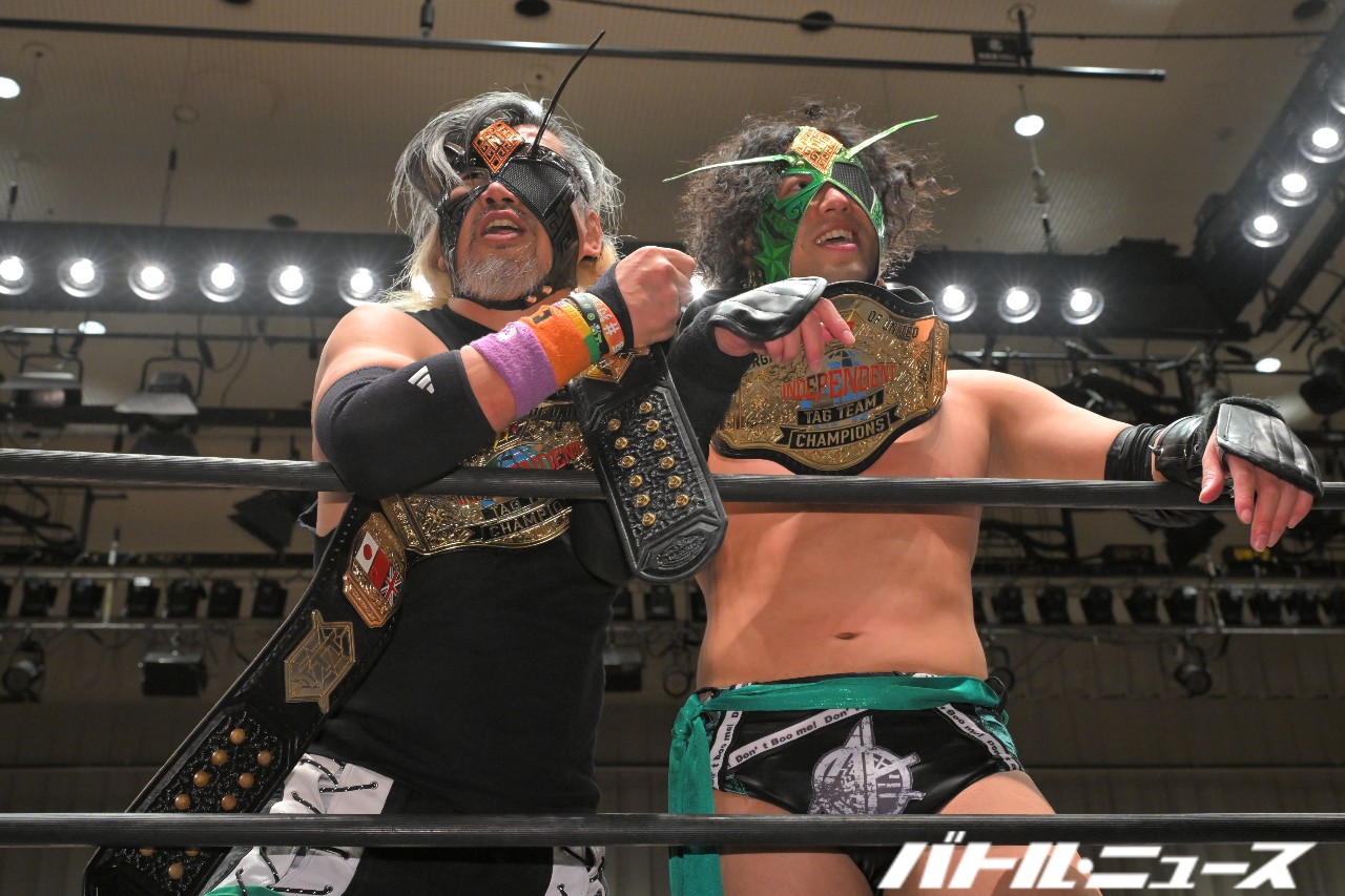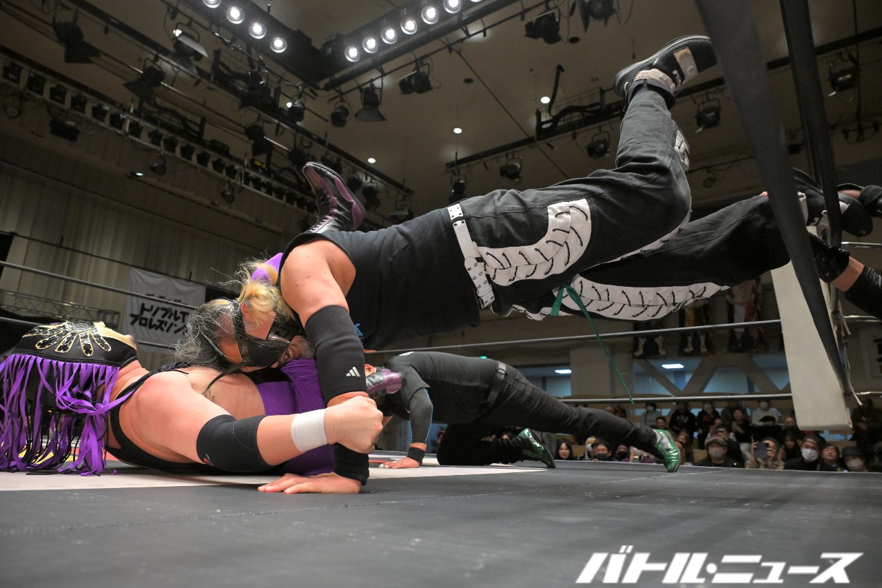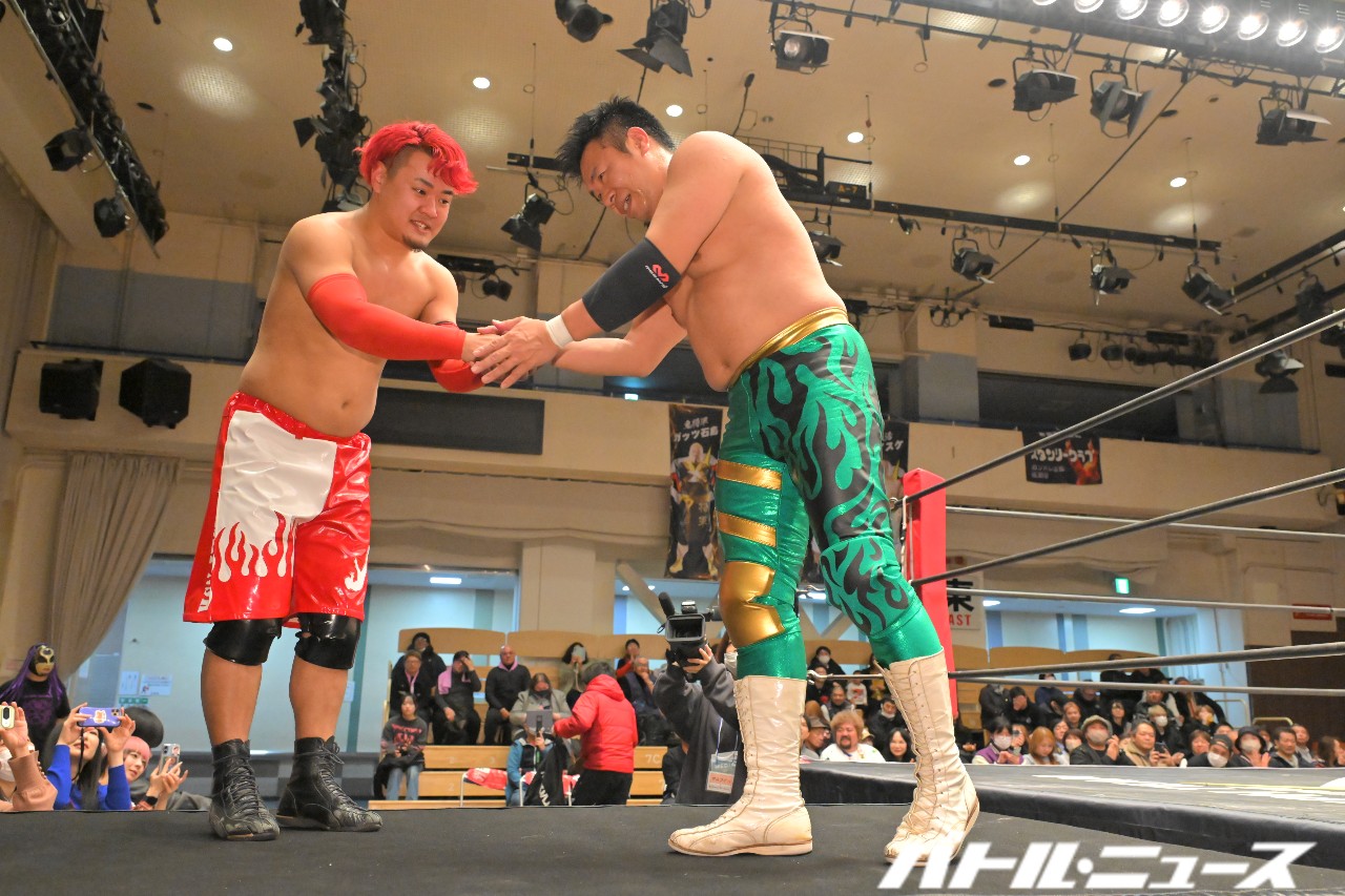 勝負を託されたミステリーが藤田にチョークスラムを狙うが、藤田がアームドラッグで切り返し、ロープに足をかけながらのスクールボーイで3カウント。混戦を制した綾斗&藤田が2度目の防衛に成功した。