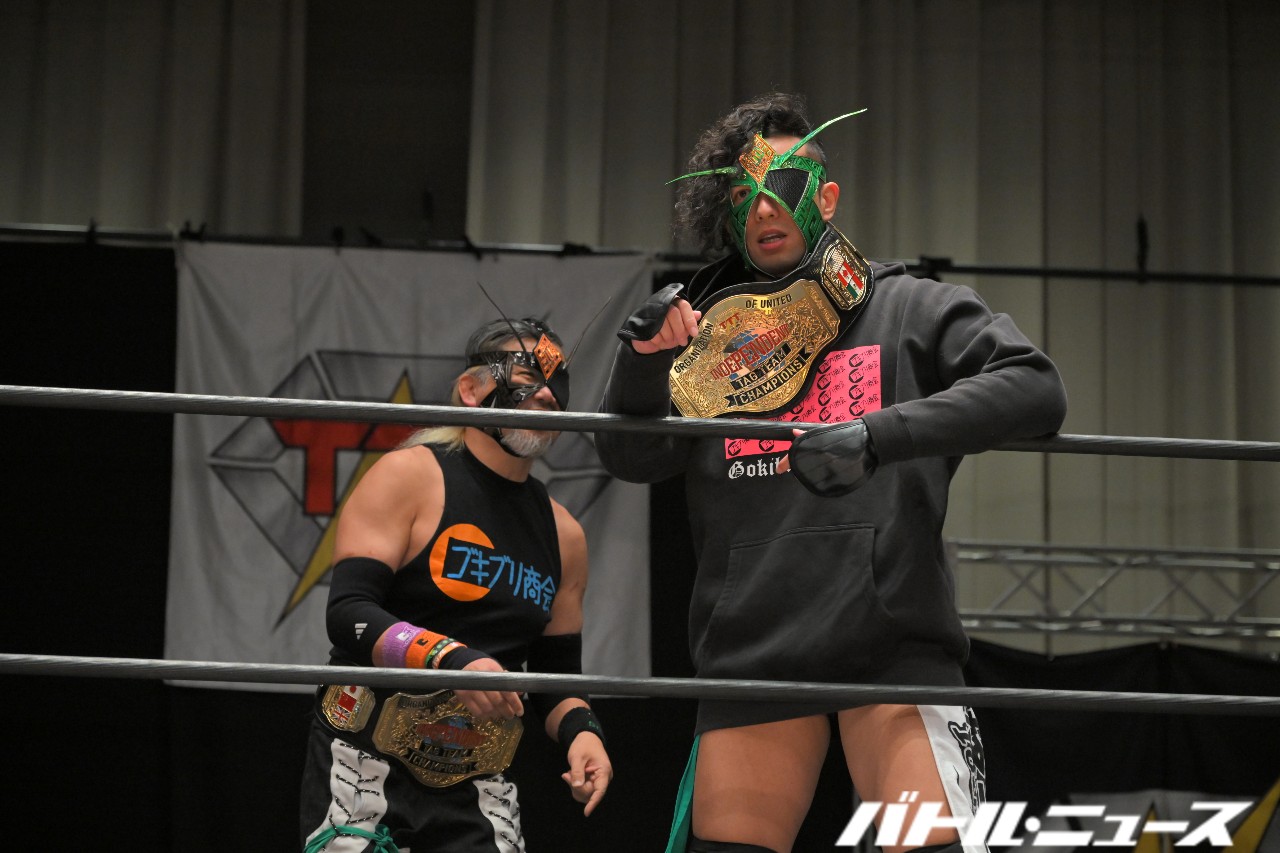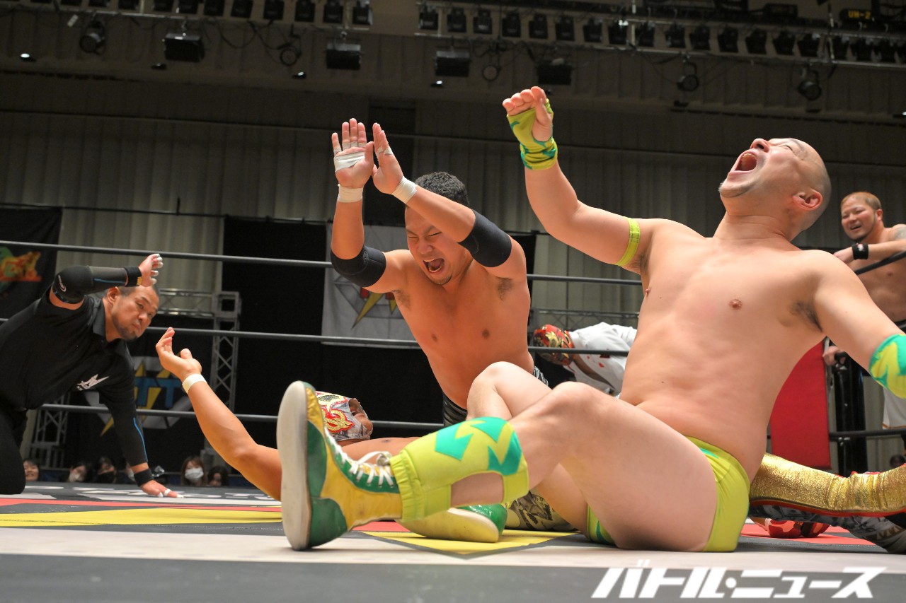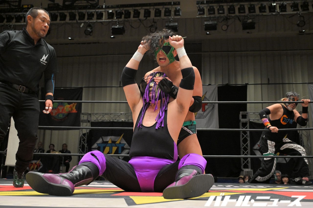 勝負を託されたミステリーが藤田にチョークスラムを狙うが、藤田がアームドラッグで切り返し、ロープに足をかけながらのスクールボーイで3カウント。混戦を制した綾斗&藤田が2度目の防衛に成功した。