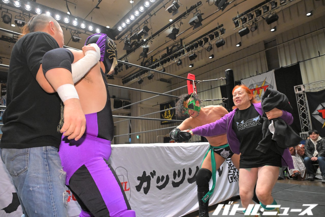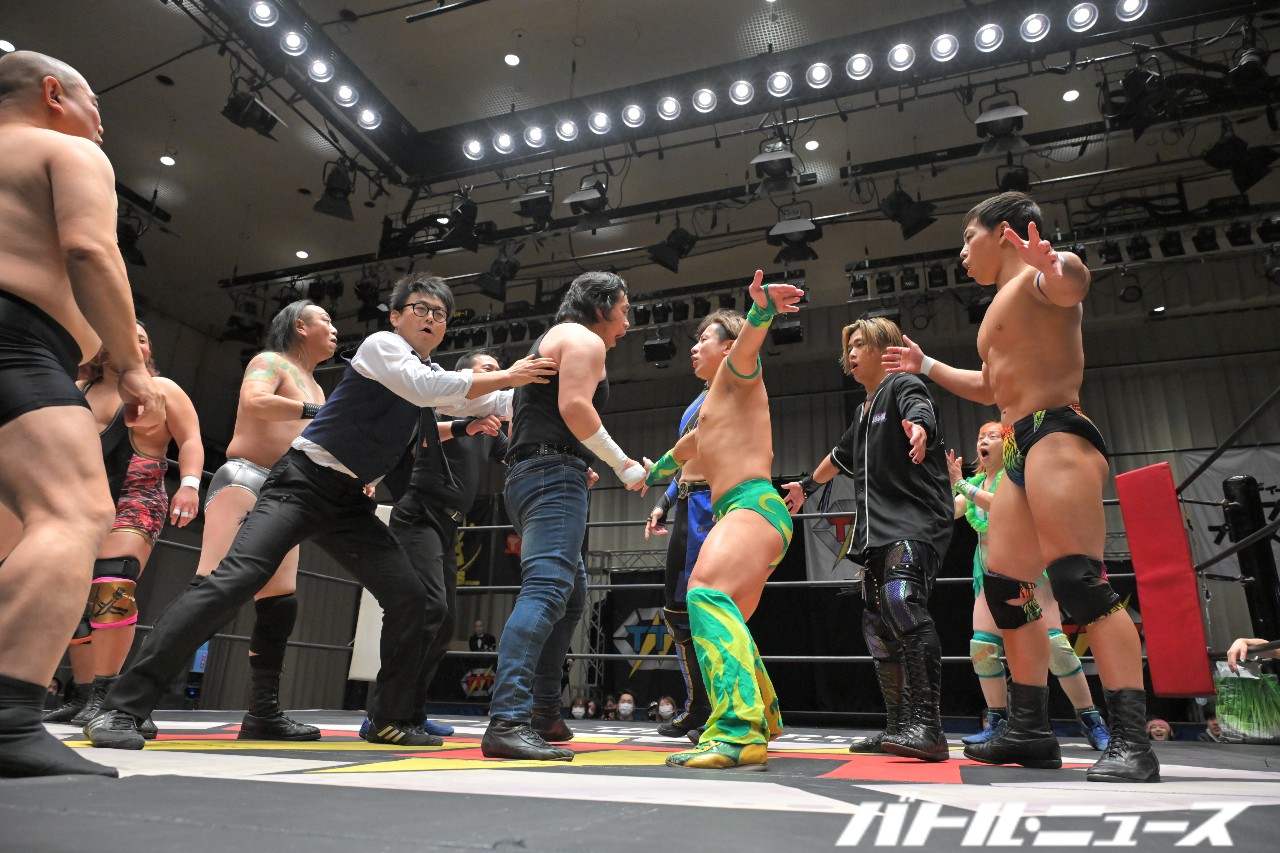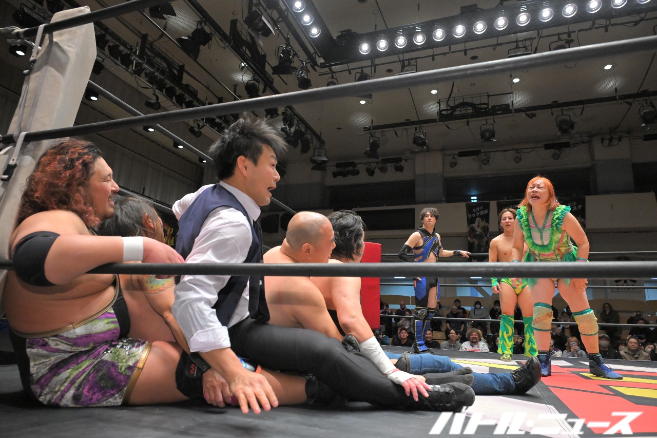 ミステリーが藤田にエルボースタンプを連打してロープに飛ぶが、綾斗がエプロンからビッグブーツ。さらに場外に落とすと、ゴキブリ商会の面々が場外で袋叩きに。そして推し活の一環として綾斗のセコンドに付いていた松澤さんも攻撃に参加させられる。