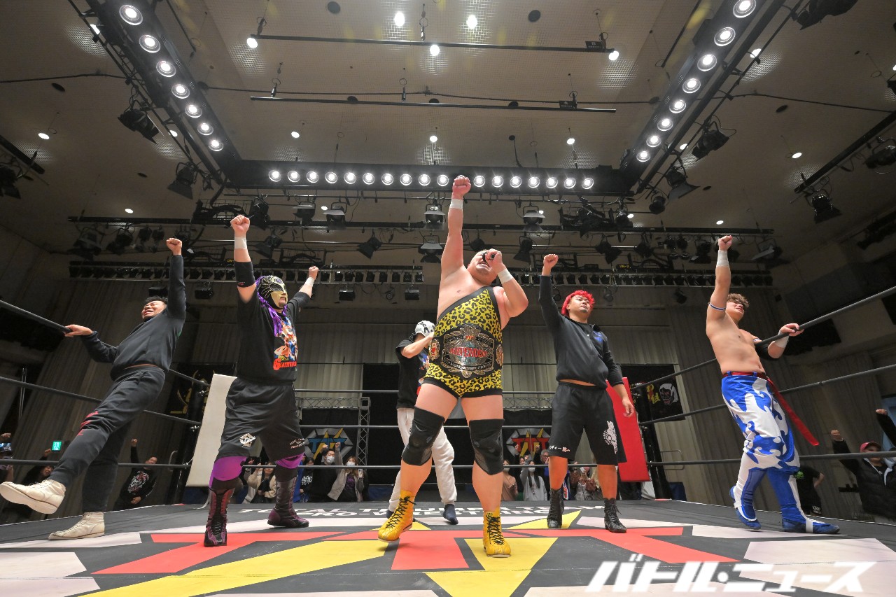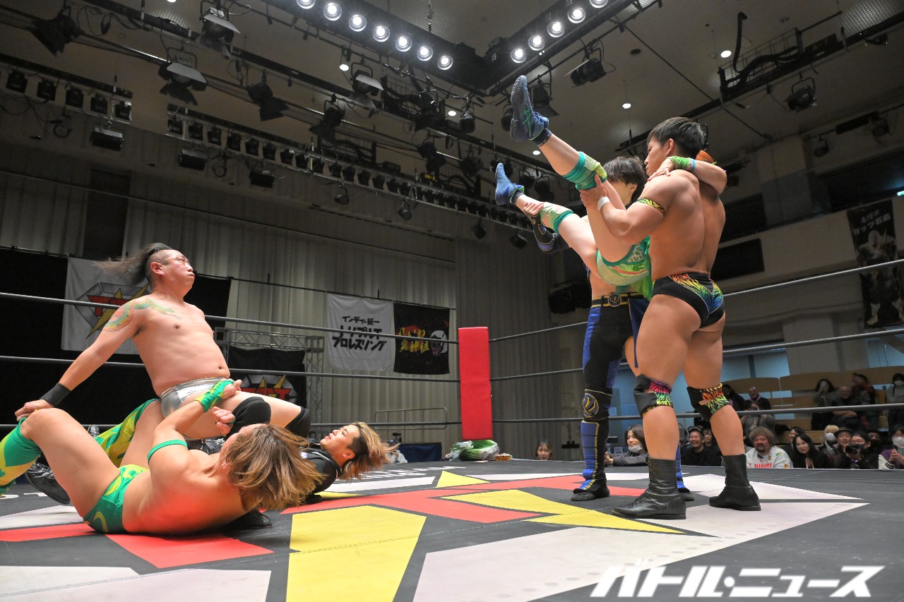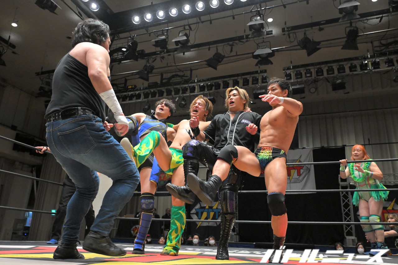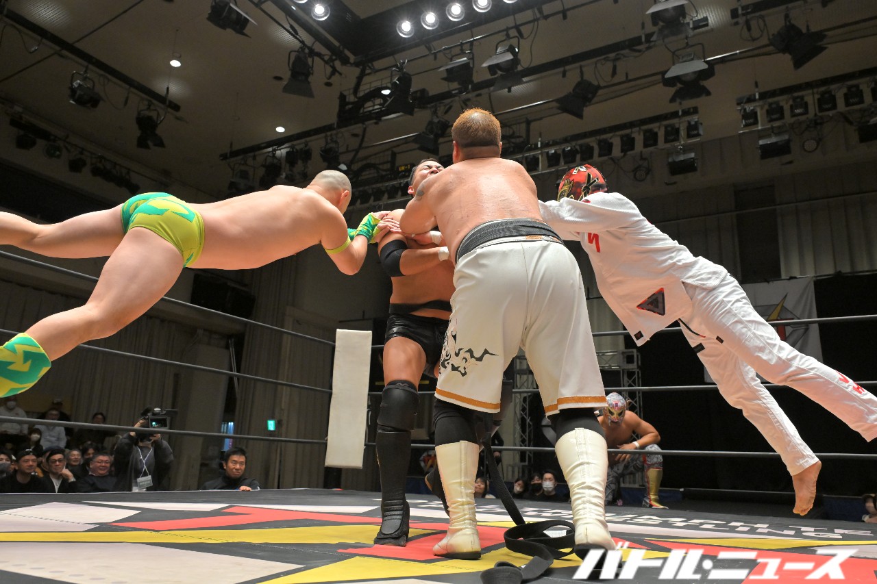 リング上に秀旺&瀧澤が上がってくると、瀧澤のバイシクル・キックから秀旺のバックドロップ。さらに藤田がダイビング・ボディプレスを見舞うもカウント2。ならばと藤田が「サヨナラーッ!」と叫びながらSAYONARAを決めるもカウント2。藤田がロープに飛ぶと、定が飛び込んできて必殺のスパインバスター。エプロンに立つ秀旺&瀧澤もショットガン・ドロップキックで場外へとふっ飛ばし、綾斗も場外へ排除。