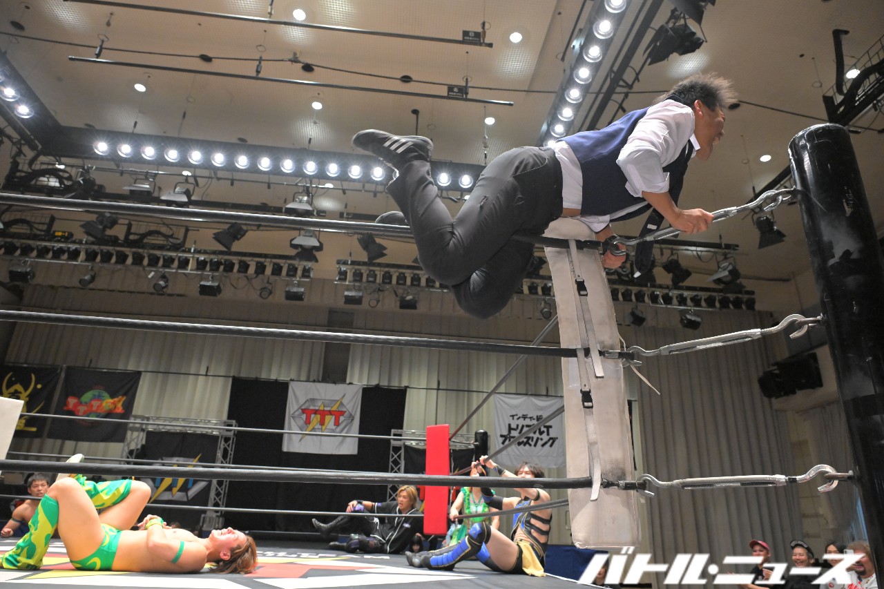 ここに川上がドロップキックを見舞って愛人進を場外に叩き出すと、渡瀬のノータッチ・トペ・コンヒーロ+宗達のラ・ケブラーダの競演。ガン☆プロ軍が一気に流れを掴む。渡瀬が中野をリングに放り込み、後頭部への低空ドロップキックを見舞ってから川上にタッチ。