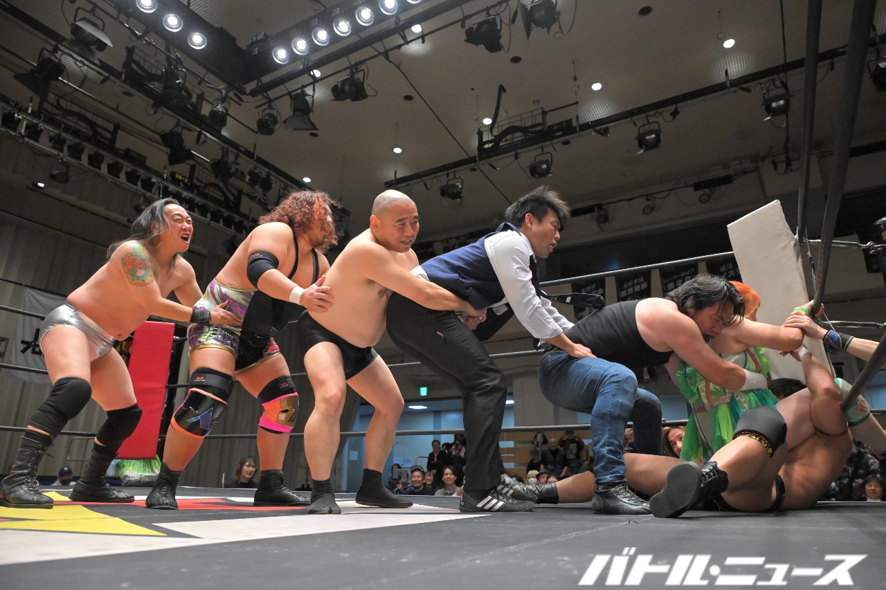 残るは、秀旺&瀧澤vs磐城という構図。秀旺と瀧澤がそれぞれビッグブーツを見舞い、秀旺がチャンス of LOVE(※ニールキック)。2人でOTRさせようとするが、磐城が秀旺のタックルを瀧澤に誤爆させ、瀧澤がOTRで失格に。