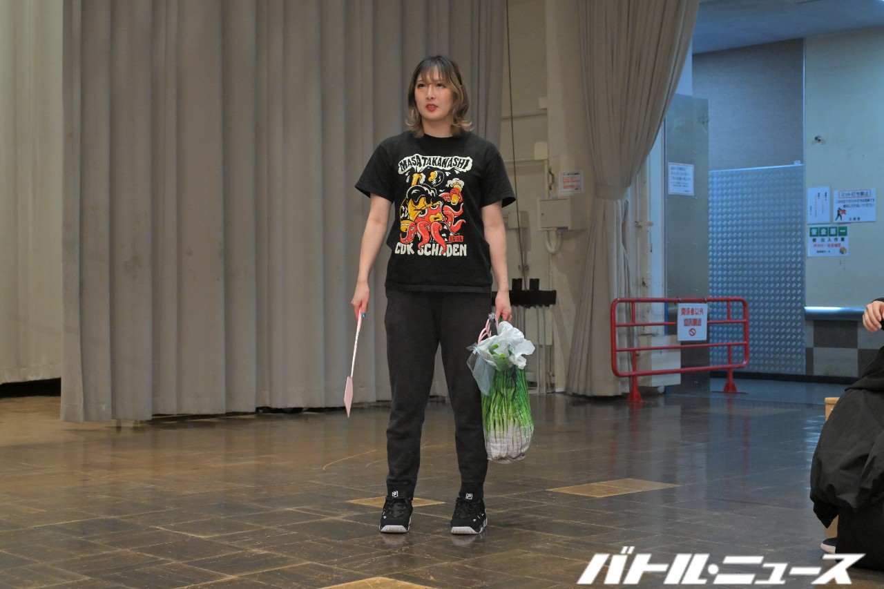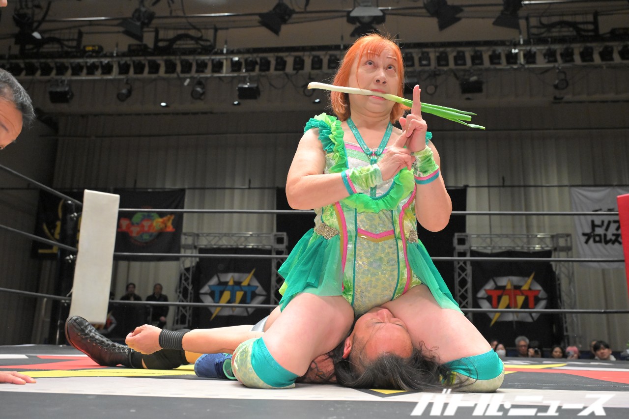 松澤さんは「アレ行くぞ~!」と口にネギを咥え、世界一おぞましい禰豆子に変身。光珠&刃が松澤さんを抱え上げて大開脚。オースギ&政岡がモンキーフリップでビッグベアーを頭から松澤さんの秘所へと投げ込み、松澤さんが顔面騎乗式三角絞めで失神KO勝利。この合体攻撃の名はラフレシア。名前から威力が想像できる恐ろしい新技での決着となった。