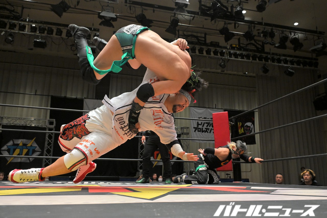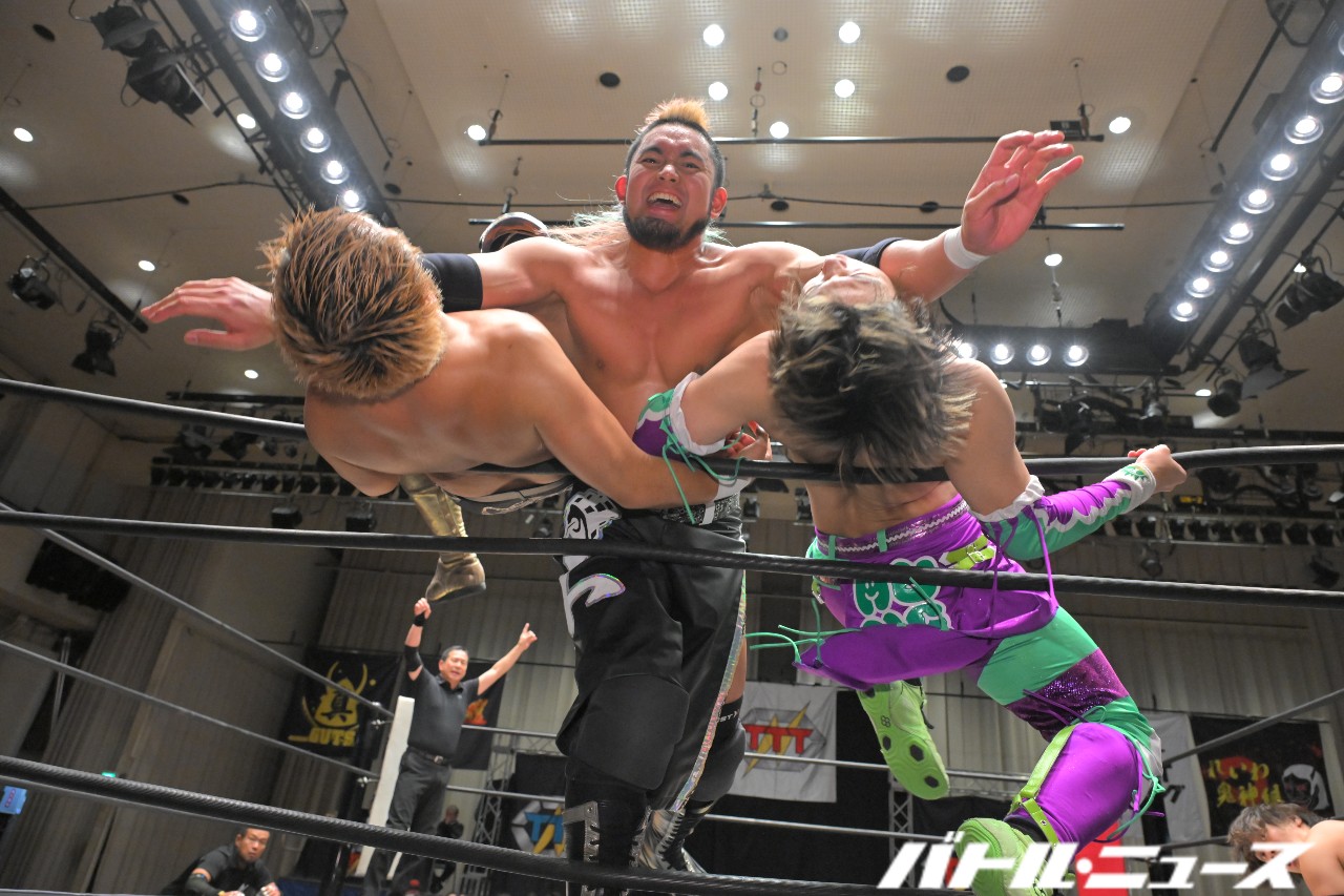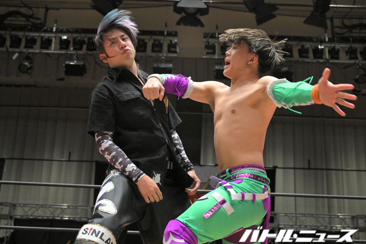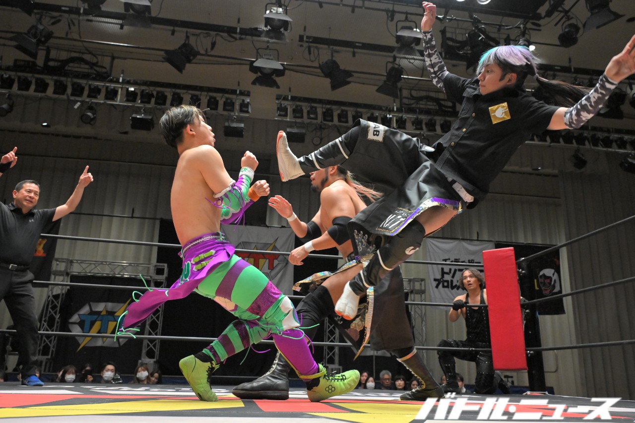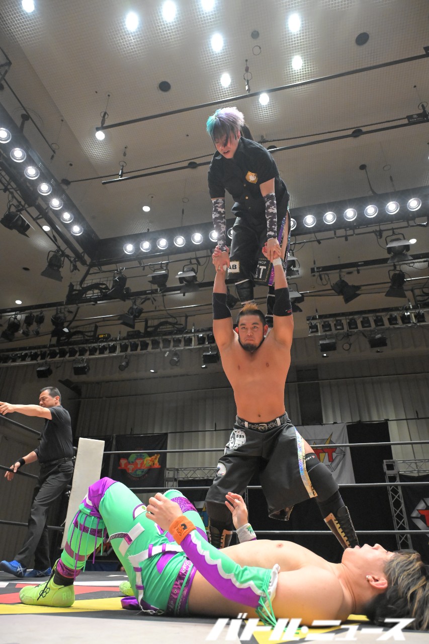 定は藤田をフロント・スープレックスで投げ捨て、綾斗にはトラースキックからスロイダー。綾斗&藤田が2人でロープに振るが、定がショットガン・ドロップキックで2人まとめて吹っ飛ばす。定が綾斗にMADE IN NERIMAを狙うが、綾斗がコブラツイストで切り返す。定が腰投げで叩きつけてコーナーへの串刺し攻撃を狙うが、綾斗が綾斗ニーからランニング・ネックブリーカー・ドロップ。綾斗が藤田にタッチ。