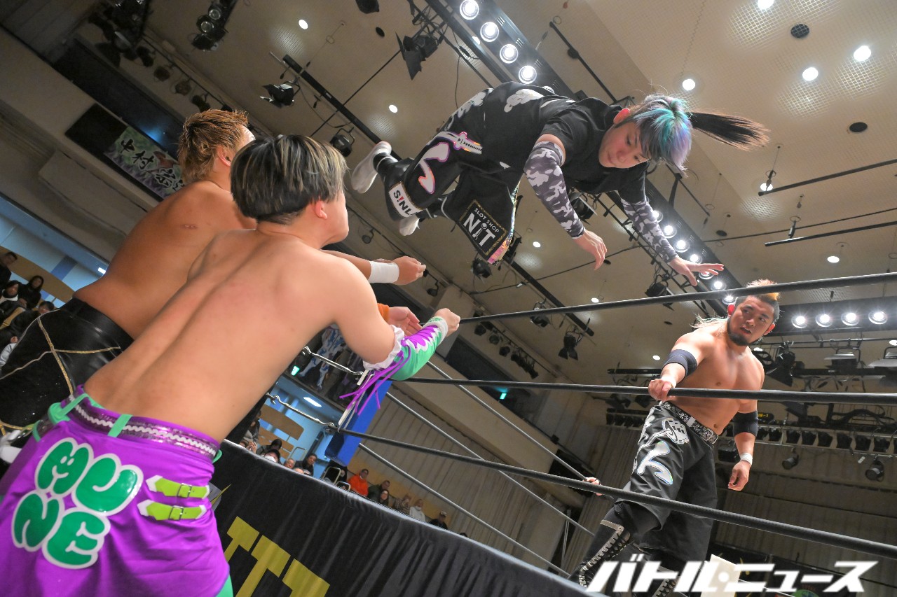 川上が長い足を活かしてビッグブーツ連打からジャンピング・バックエルボー、レッグラリアートと連撃。川上がバックドロップを狙うが、進が振り払ってキチンシンクからストマック・ブロック。さらにクロスフェイスで捕らえるが、宗達が慌ててカット。渡瀬&宗達が2人がかりで中野を場外に放り出そうとするが、中野が619で2人の意表を突いた攻撃を見舞い、神野がダブルラリアットで場外に叩き出す。そして神野が中野をショルダースルーでホイップする形で中野がプランチャを見舞う。