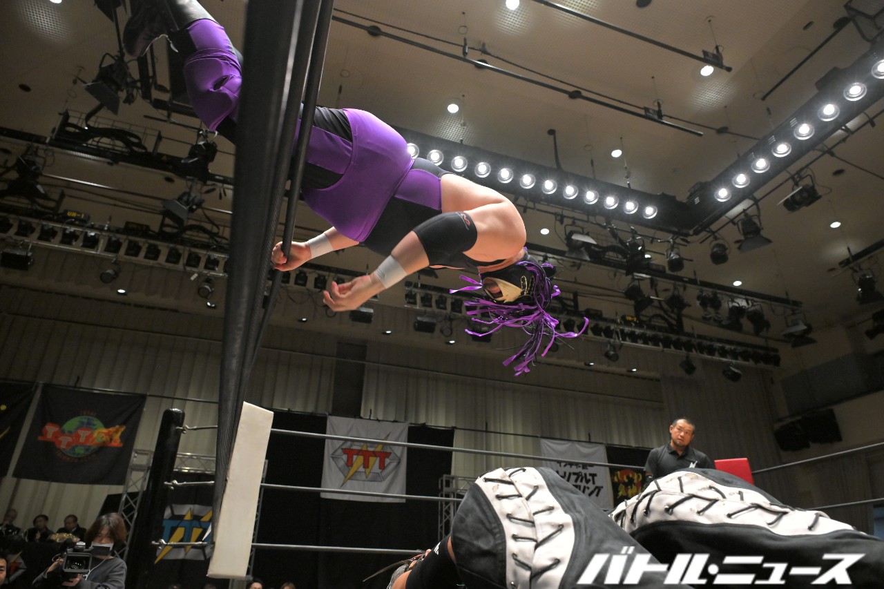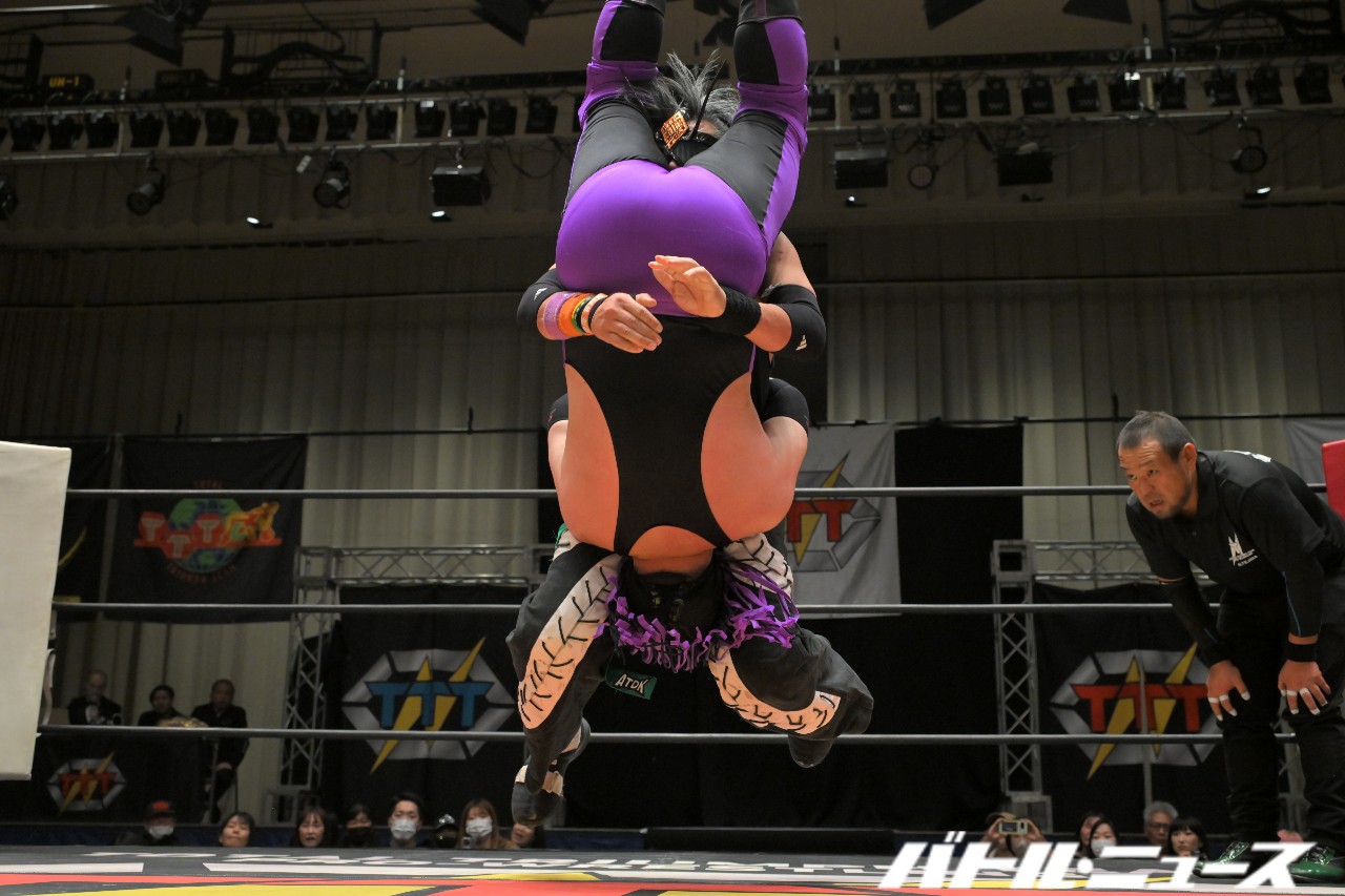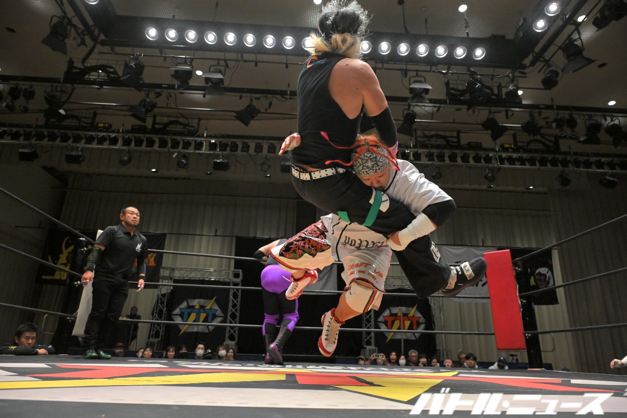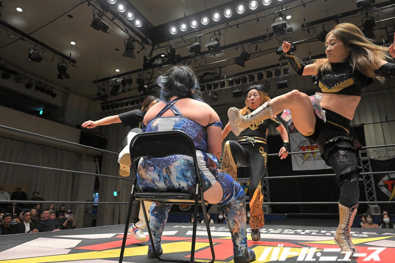 薮下は黒帯でナナミを殴打していくが、ナナミは串刺しボディスプラッシュからショルダータックル。薮下は髪を掴んで引き倒してからロープに飛ぶが、ナナミがカウンターのデスバレー・ドライバーを決めて生還。香藤にタッチ。