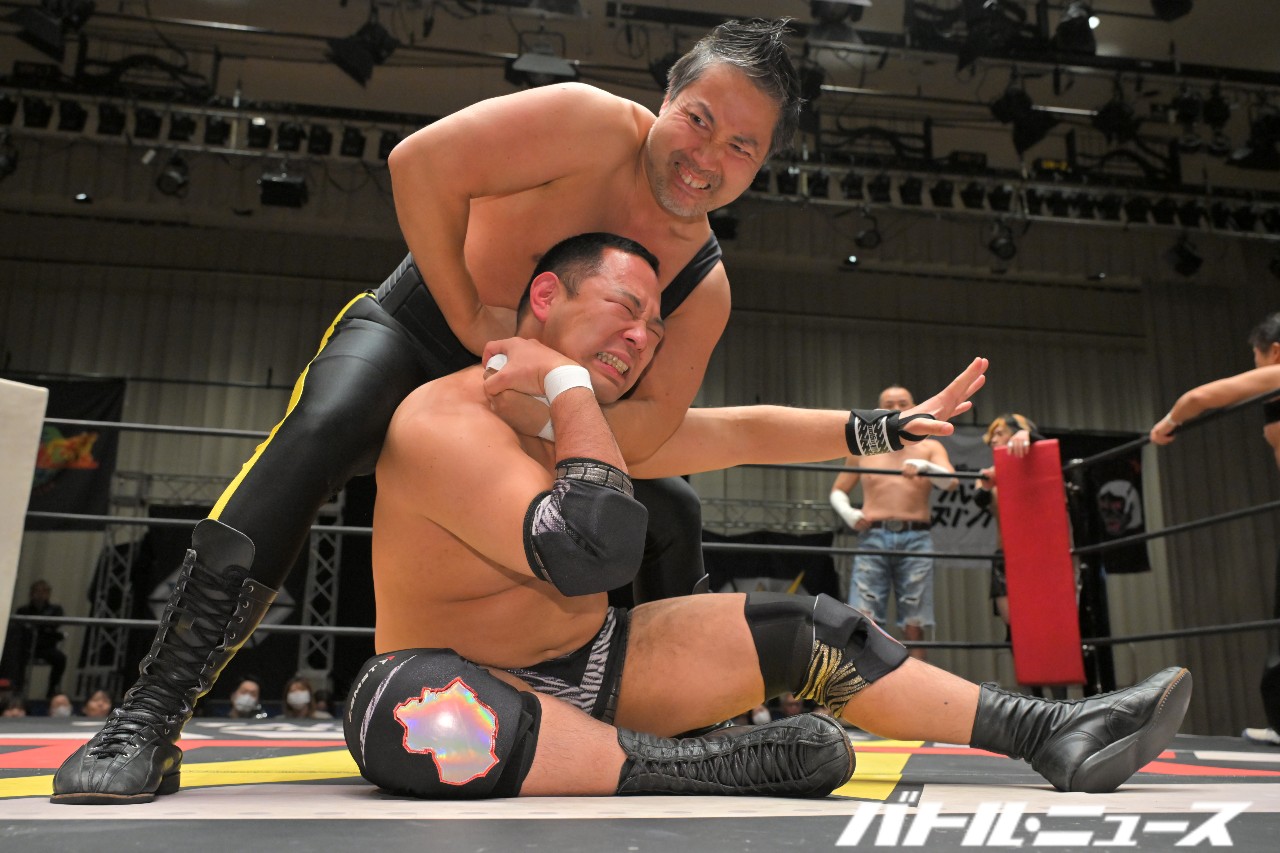 橋之介はダイスケをリングに戻してセントーン・アトミコ。さらにエルボーを連打していくが、ダイスケは「来いよ!」と両手を広げてすべてを受け切った上で現役時代と変わらぬ強烈な左のエルボーバッドを叩き込む。橋之介も「来いよ!ダイスケ!」と仁王立ちする現役の意地を見せるが、再びダイスケがエルボーでなぎ倒してフェイスロック、エルボードロップ、再びのフェイスロックと連撃。