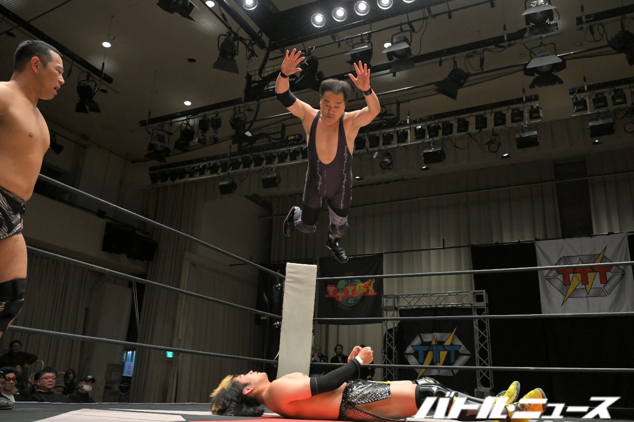 これで形勢は3vs3の互角に。瀧澤と木村が打撃戦を展開し、逆水平チョップで打ち勝った木村がボディスラム。磐城、服部とともに串刺し攻撃を見舞っていき、磐城のボディスラムから木村がダイビング・ボディプレス。これは綺麗に決まるも、秀旺らがカット。木村がロープに飛ぶが、瀧澤はヒザへの低空ドロップキックで姿勢を崩してから顔面への低空ドロップキック。松崎にタッチ。