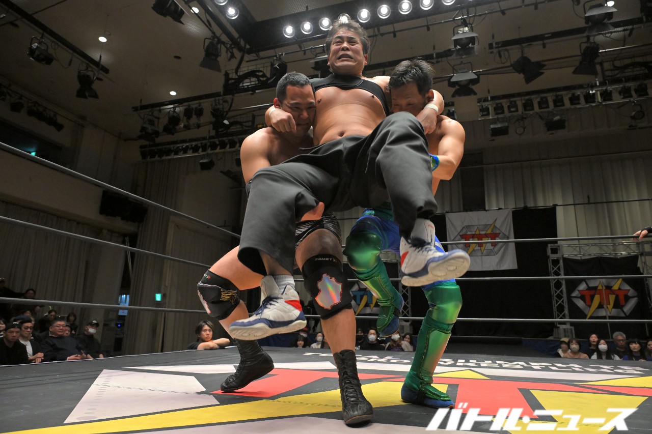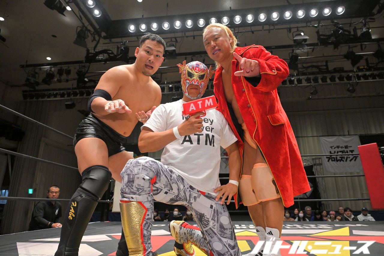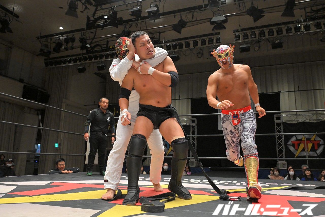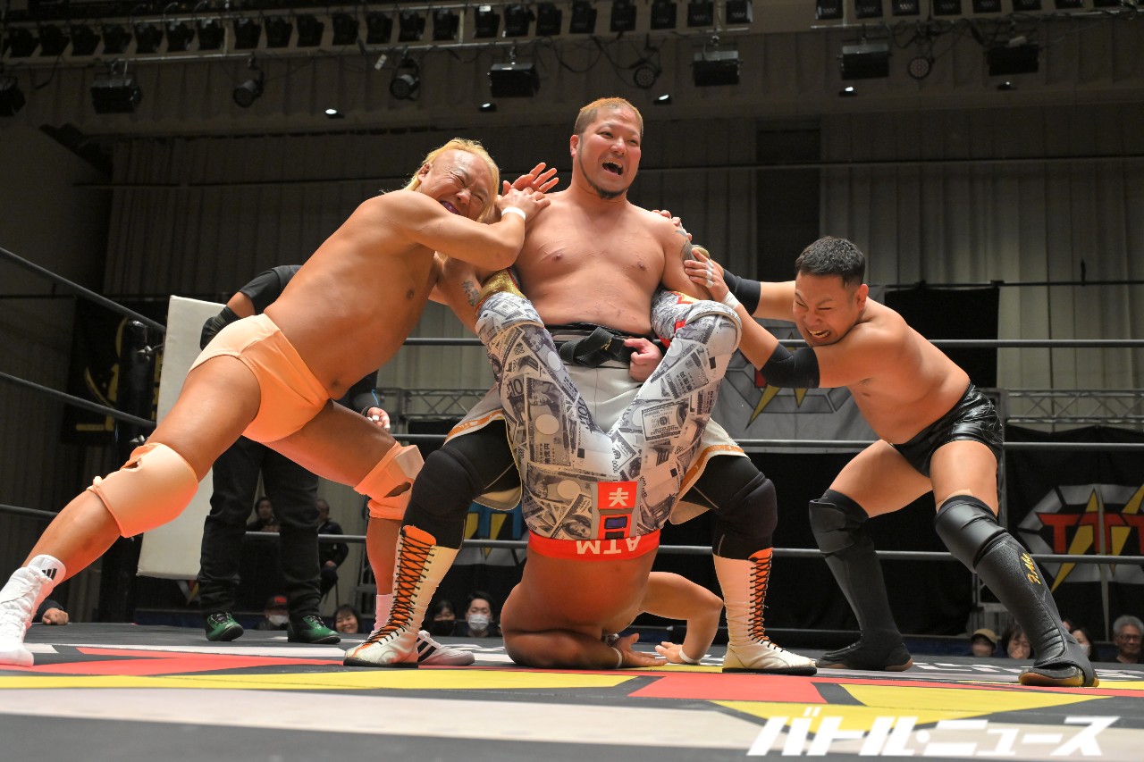 塚本が「終わりだ!」と逆エビ固めに捕らえると、佐野&阿部がATMを助けようと塚本の身体を引っ張るが、これが逆エビ固めの反りを強める形となりATMが必要以上の大ダメージを負う。