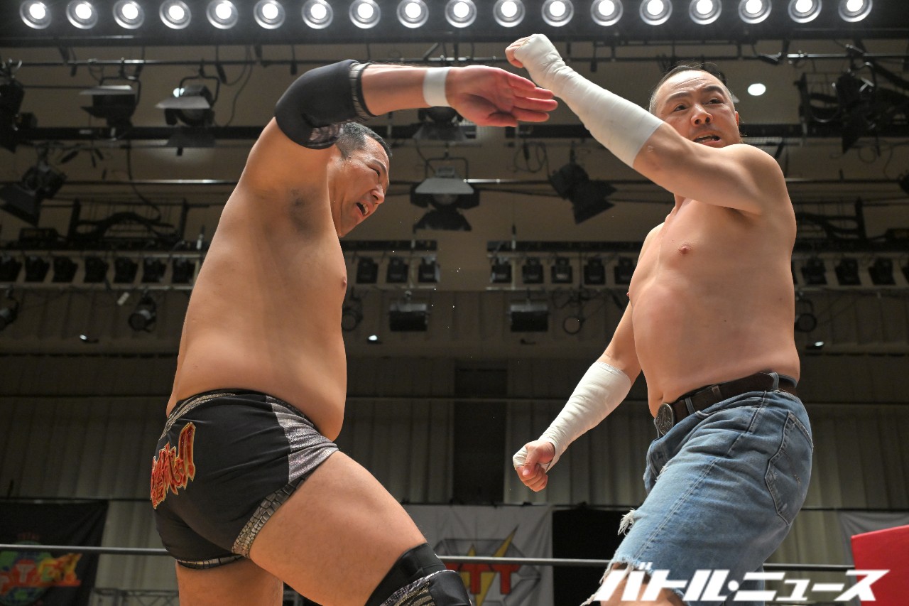 渡瀬は神野をコーナーに振って串刺しバックエルボーからダイビング・フットスタンプ。さらにブレーンバスターを狙うも、神野が振り払って逆水平チョップ。渡瀬も強烈なエルボーで反撃し、互いに得意とする打撃技での打ち合いに。神野のラリアットをビッグブーツで止めた渡瀬がビンタを見舞うも、神野は追撃のエルボーを巻き取ってアングルスラム。渡瀬もすぐに起きてジャーマン・スープレックスを決めるが、神野もすぐ起きてラリアット。間髪を入れずに神野がブレーンバスターを狙うが、渡瀬が垂直落下式ブレーンバスターで切り返す。両者タッチ。
