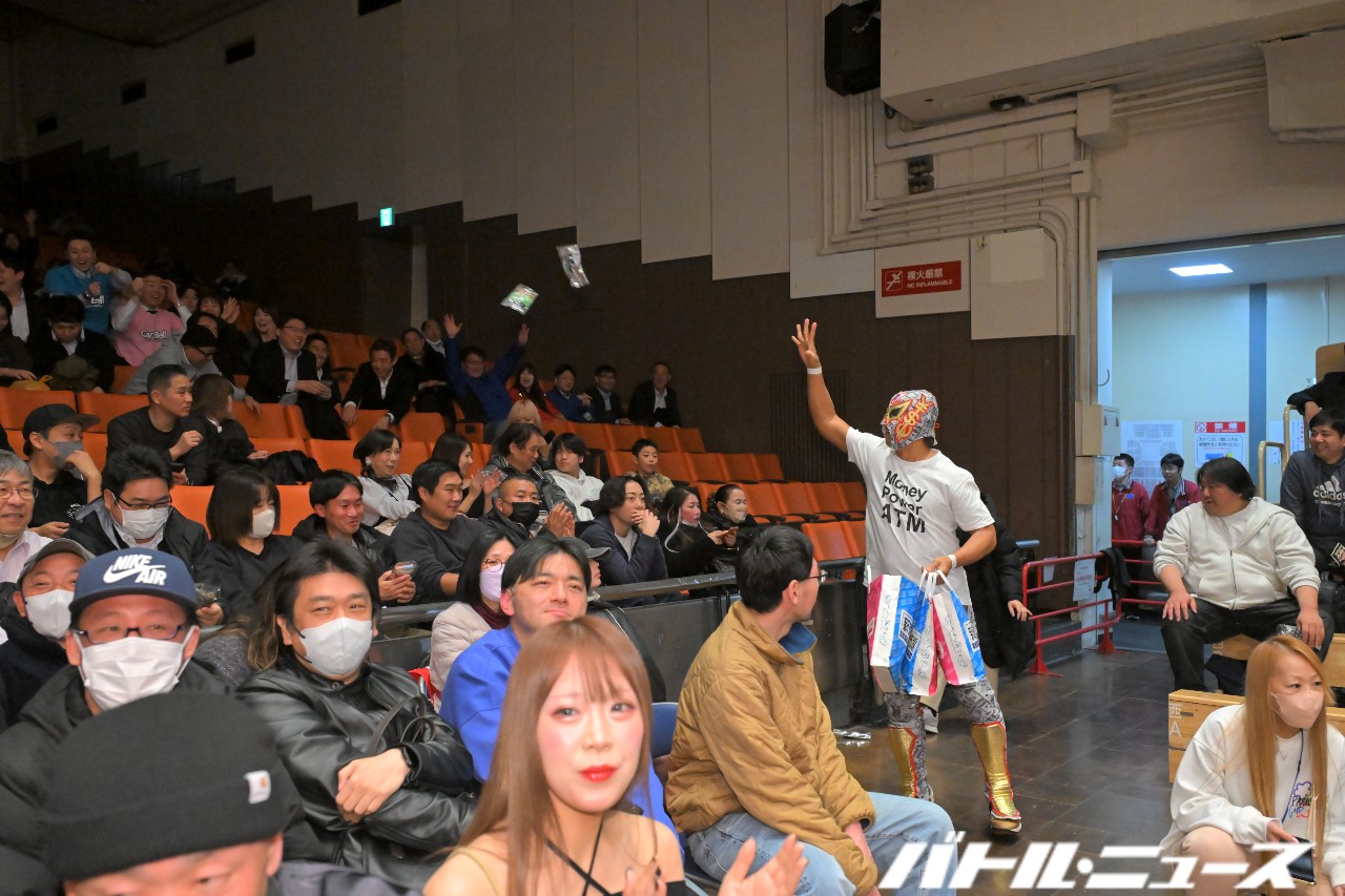 神崎が場外戦へと連れ出し、観客席までなだれ込んでの乱闘に。やはり後楽園ホールに来るとやりたくなってしまうのか、西側観客席の「西」のボードにガッツを叩きつけて神崎は大喜び。東側にも行こうとするが、ガッツが阻止して逆に「東」のボードに神崎を叩きつける。このボードを破損すると莫大な弁償費用がかかるということで、石川会長が本部席からガチ目にキレながら止めるよう懇願。