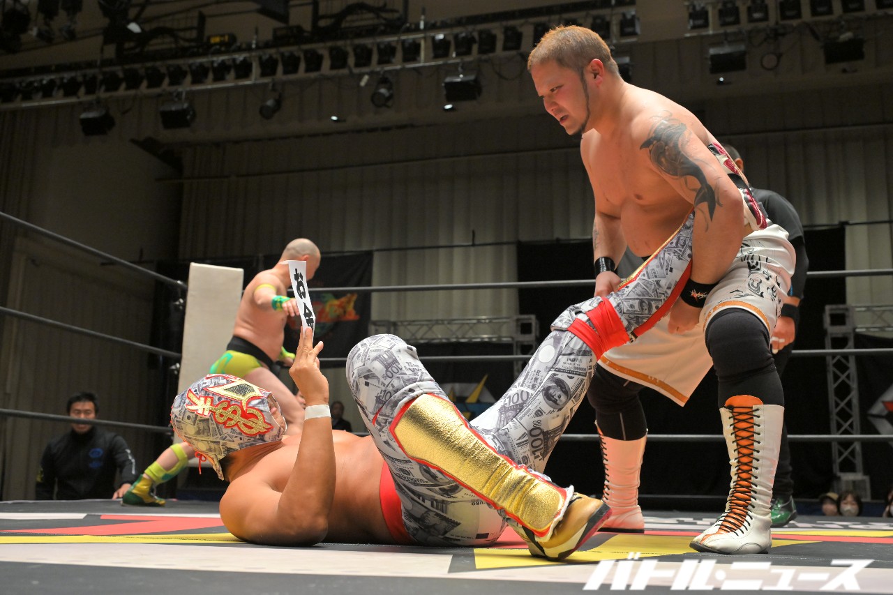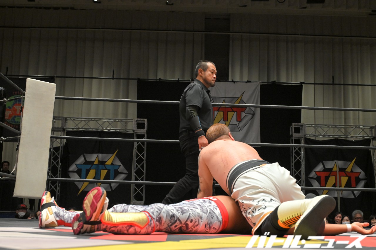 ATMがロープに飛ぶと塚本がバックエルボーで迎撃してカバー。しかし、レフェリーは超スローカウントで忖度。ATMがロープに振ってヒップアタックを決めると、レフェリーが超高速カウントを叩き始める。
