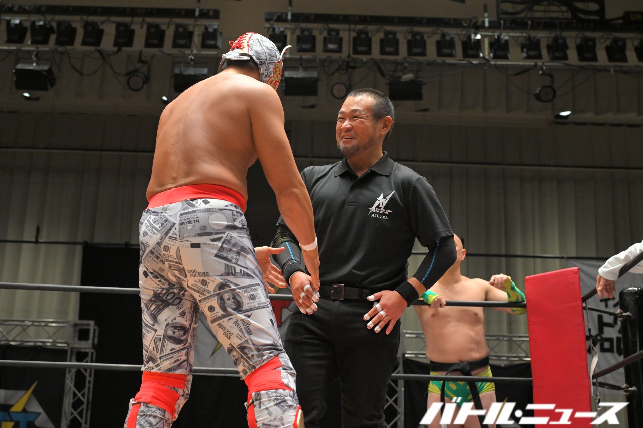 ATMは「効いてるだろ!痩せ我慢してるぞ!」と文句を言いつつ、「おい、チャンピオン。こんなもんか?来い!」と仁王立ち。塚本がエルボー一発で倒してレッグスプレッドで絞り上げると、“お金”と書かれた封筒を差し出して「お金あげるからやめろ!痛いことするな!」と懇願。